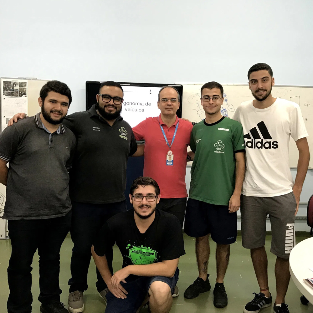 No dia 6 de novembro, o Grupo de Pesquisa Ergonomia do Produto, do Ambiente e a Cognição Humana, coordenado pelo LaErg, realizou a formação de cinco alunos da graduação em Engenharia Mecânica da FEG-UNESP, de Guaratinguetá/SP. O assunto abordado referiu-se a Ergonomia Automotiva e suas aplicações ao Projeto SAE, atividade na qual os alunos de engenharia desenvolvem um veículo motor a combustão segundo os critérios estabelecidos pelo SAE. A parceria visa, também, receber a colaboração dos alunos em engenharia mecânica nos projetos desenvolvidos pelos alunos de Design do 6º semestre do UNIFATEA, quando estes deverão construir um veículo da categoria G-Force.