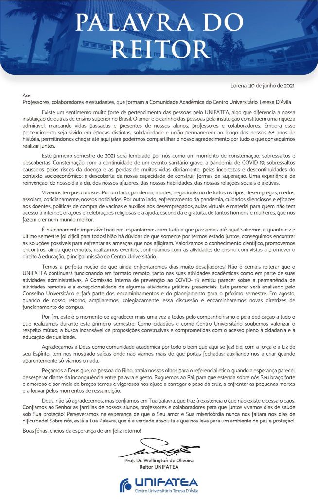 Palavra do Reitor julho 1, 2021 Navegação de Post Anterior Post anterior: Ex-aluna do curso de Biologia do UNIFATEA é aprovada em programa de doutorado na USPPróximo Próximo post: Ex-aluna de Jornalismo do UNIFATEA concorre ao Prêmio Abradi Digitalks Profissional Digital Deixe uma respostaCancelar resposta Este site utiliza o Akismet para reduzir spam. Saiba como seus dados em comentários são processados.