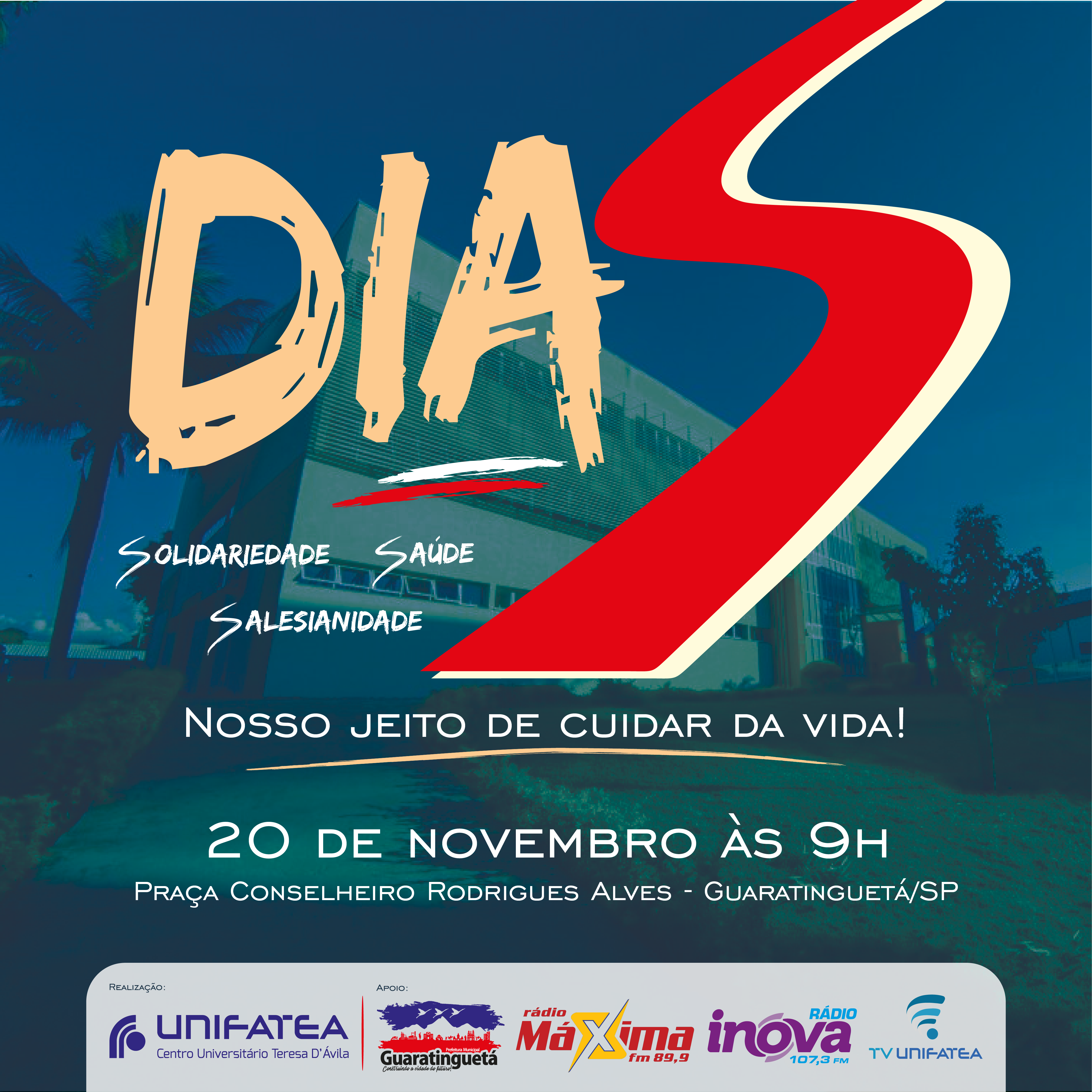 O Dia S tem como proposta promover o conjunto de valores e princípios que fundamentam a práxis do UNIFATEA. Com a chamada: “Nosso jeito de cuidar da vida”, o UNIFATEA convida a população a fazer parte de um instante que oportunize e sensibilize a repensar o valor da nossa existência neste mundo.
