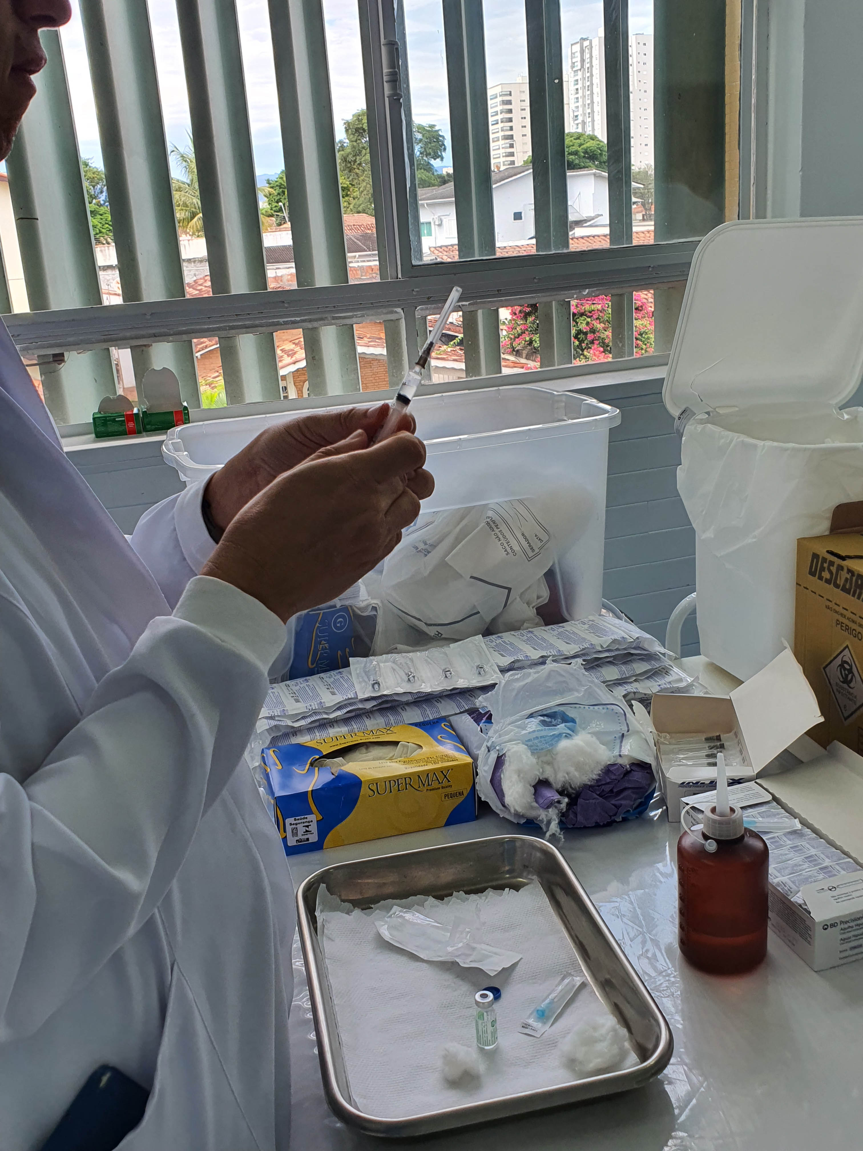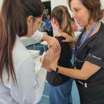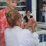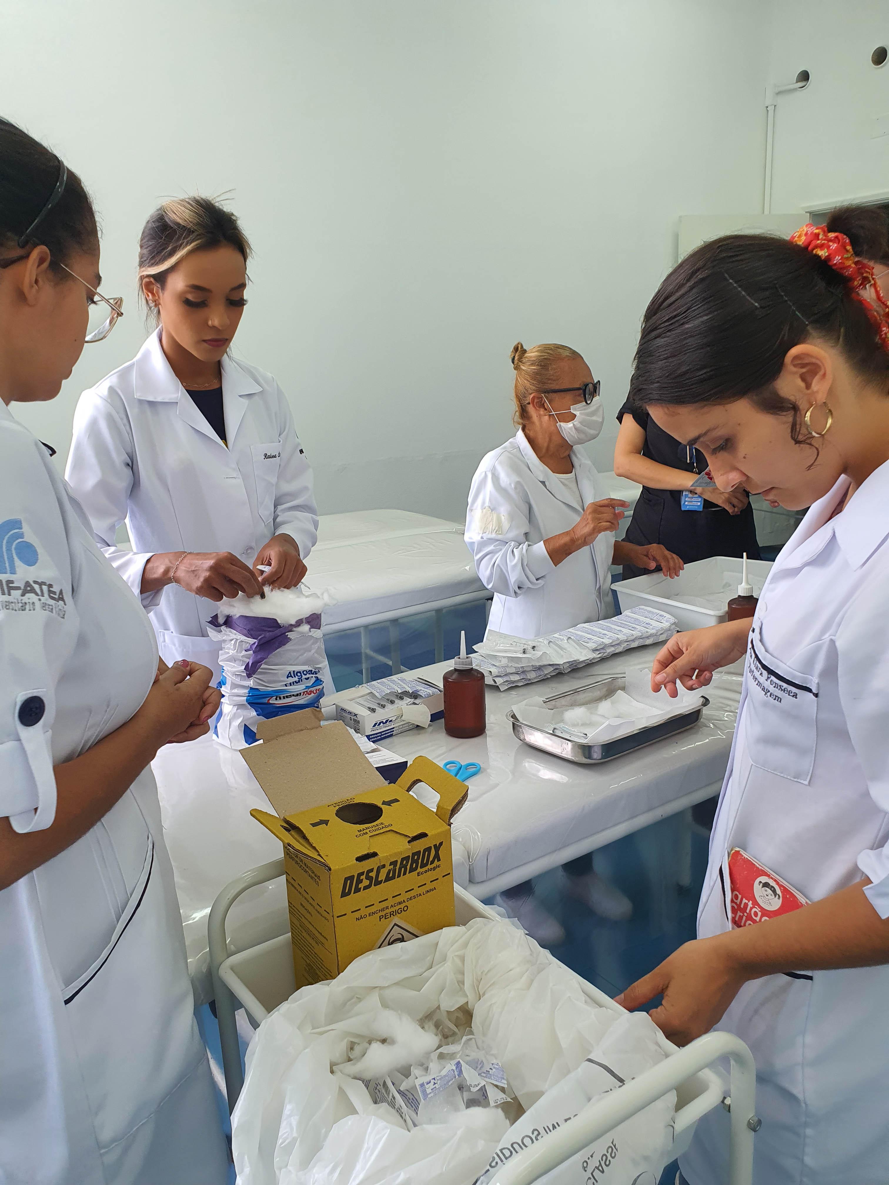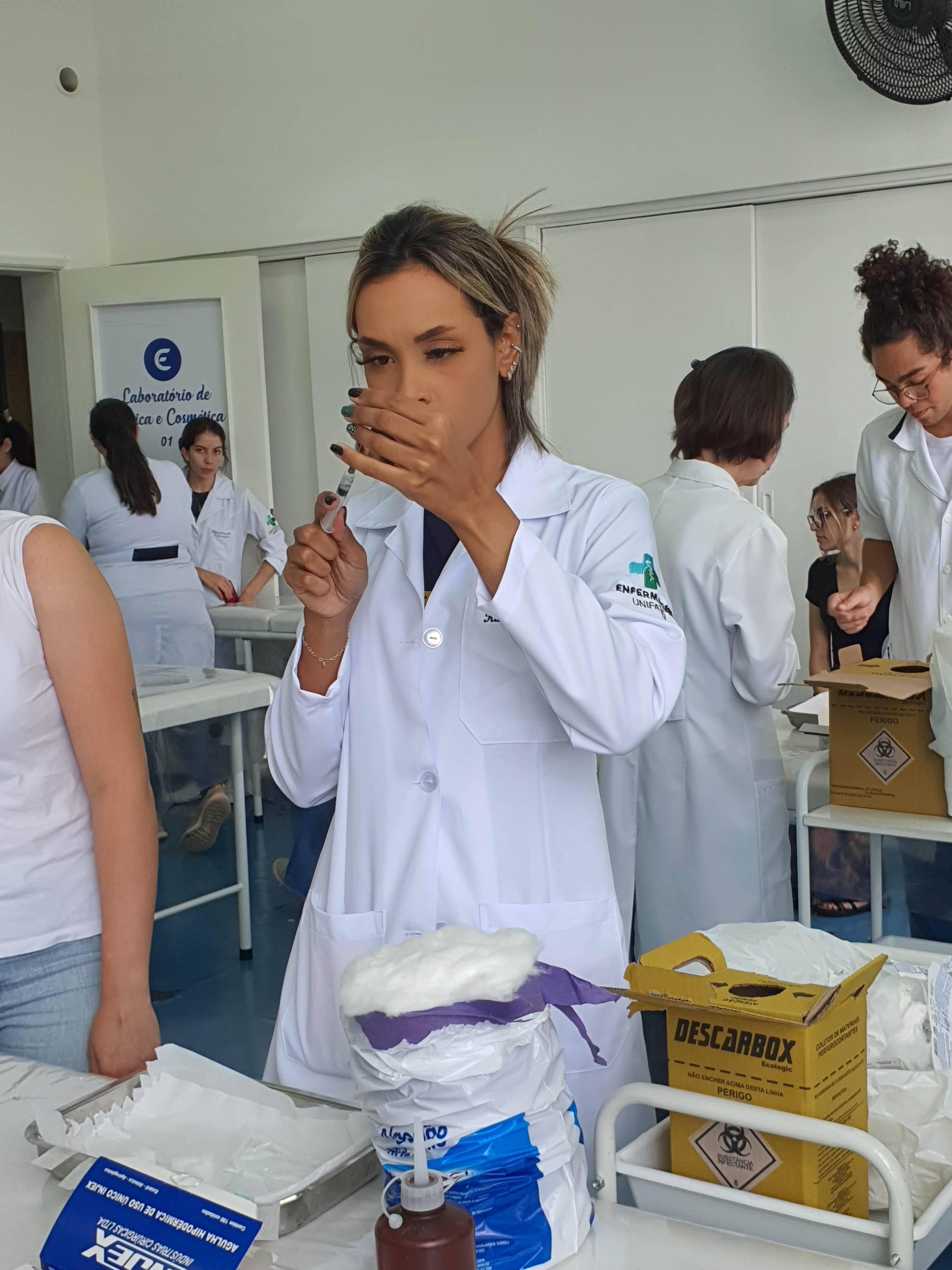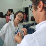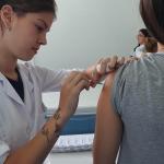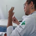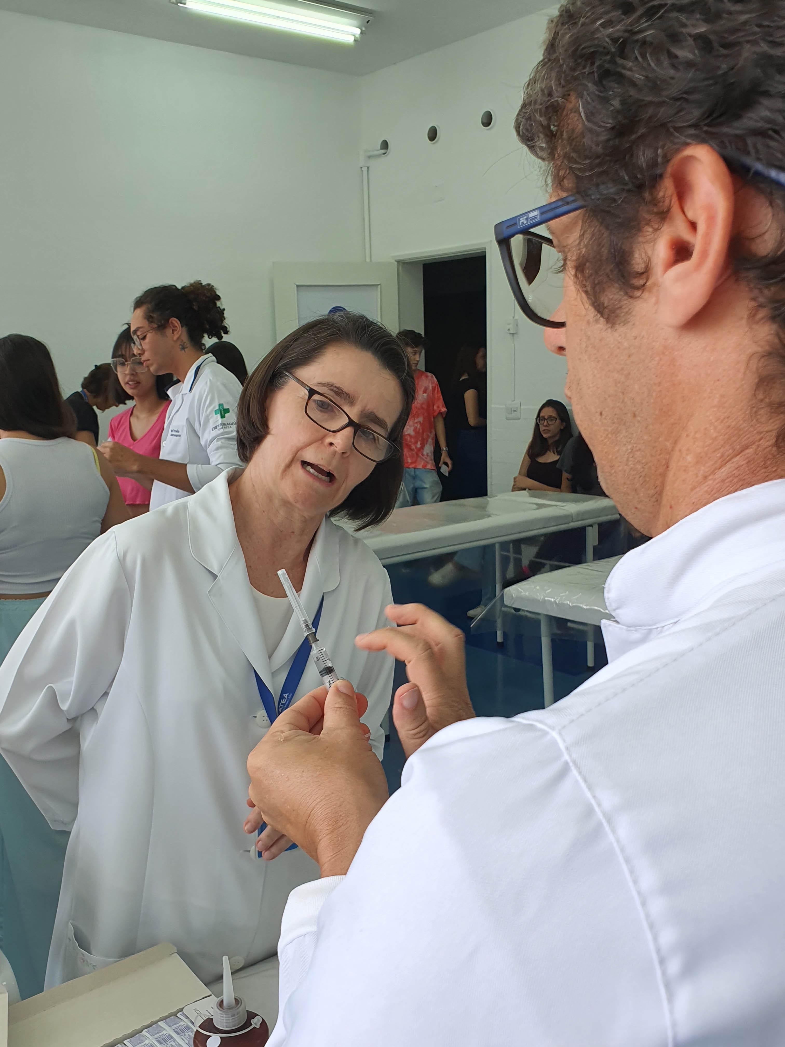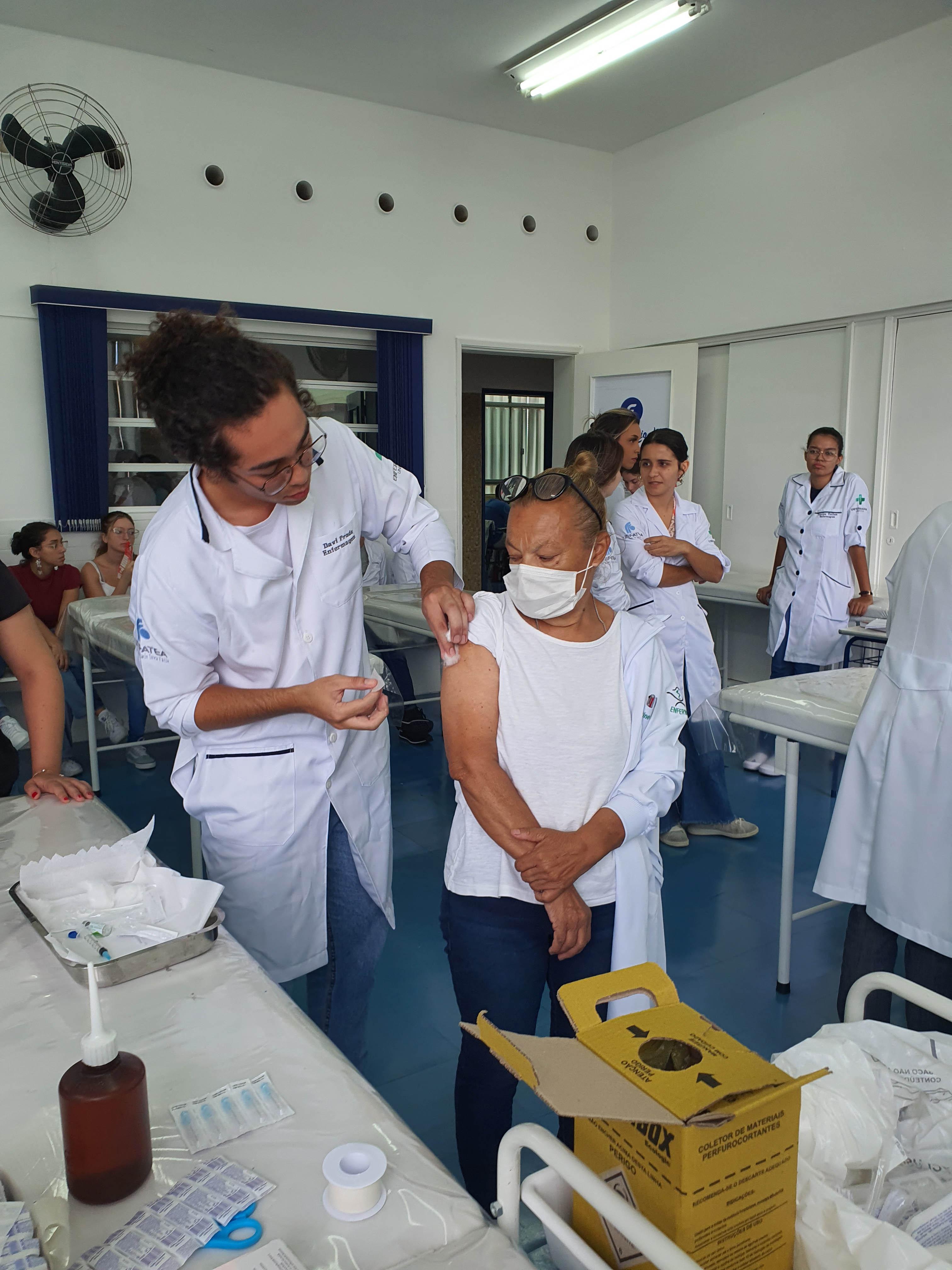 Acompanharam a vacinação, realizada no Laboratório de Enfermagem, técnicos da Secretaria de Saúde. As doses foram ministradas pelos alunos do quarto ano de Enfermagem. Antes eles preencheram ficha de cadastro e posteriormente receberam a imunização.