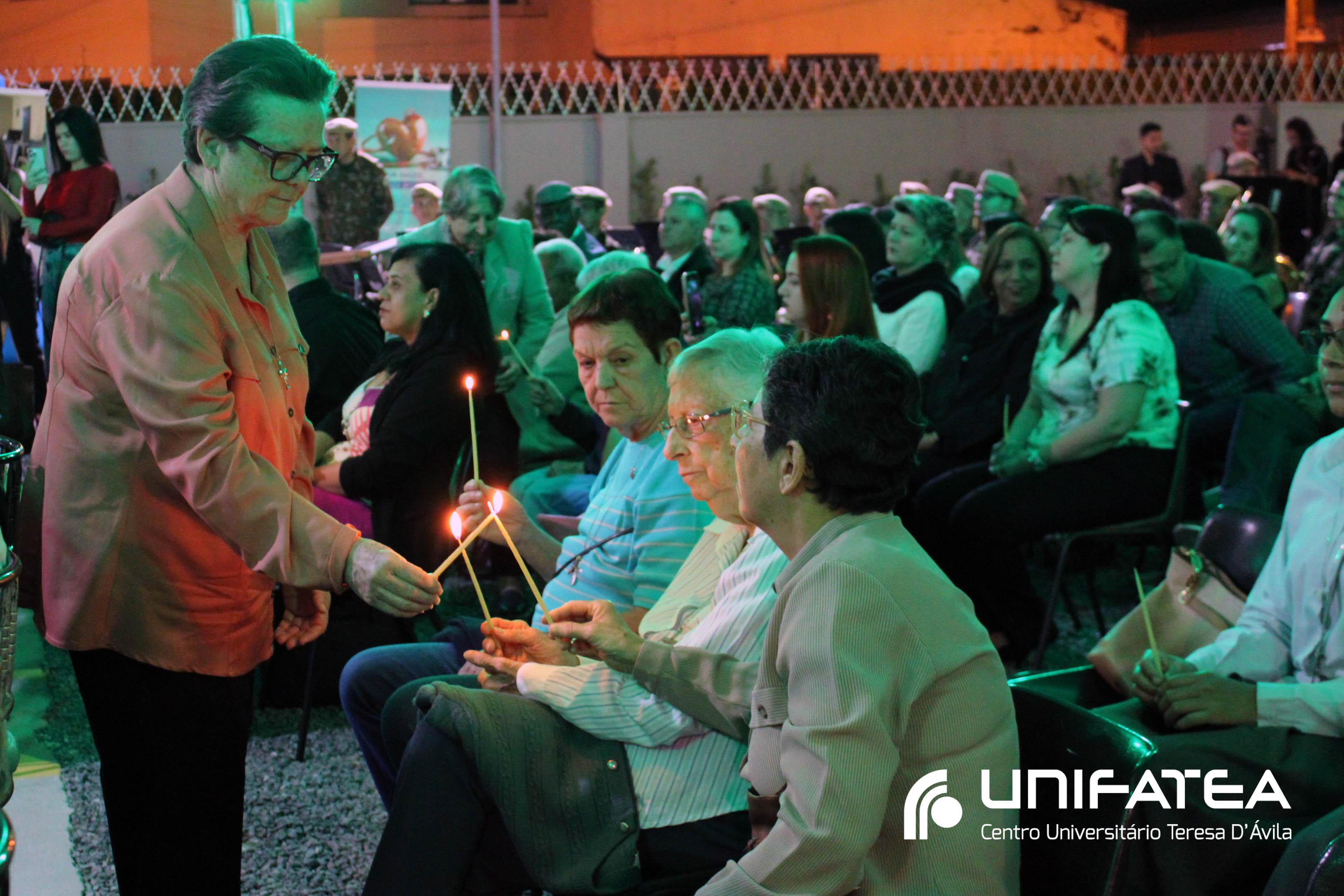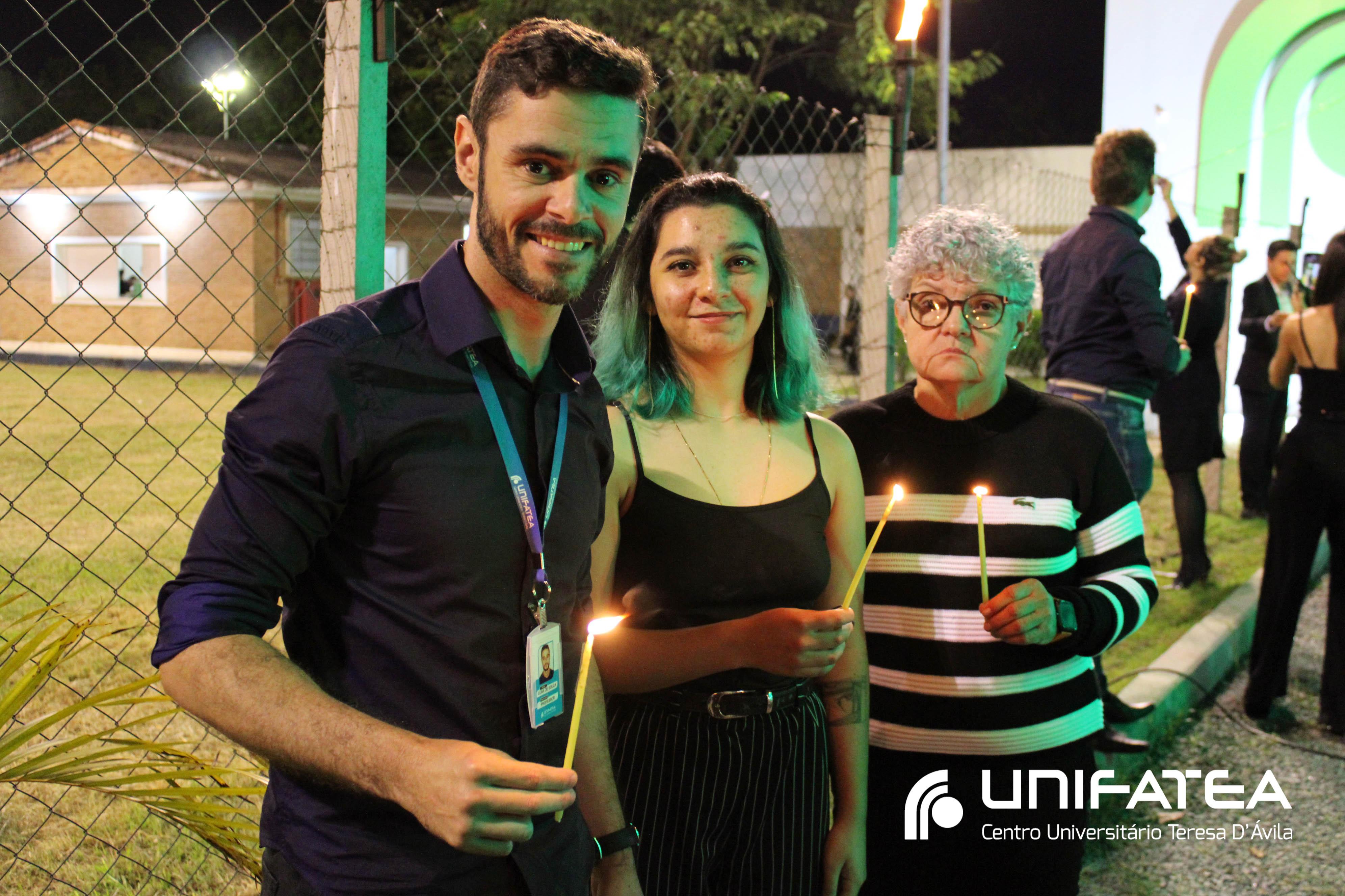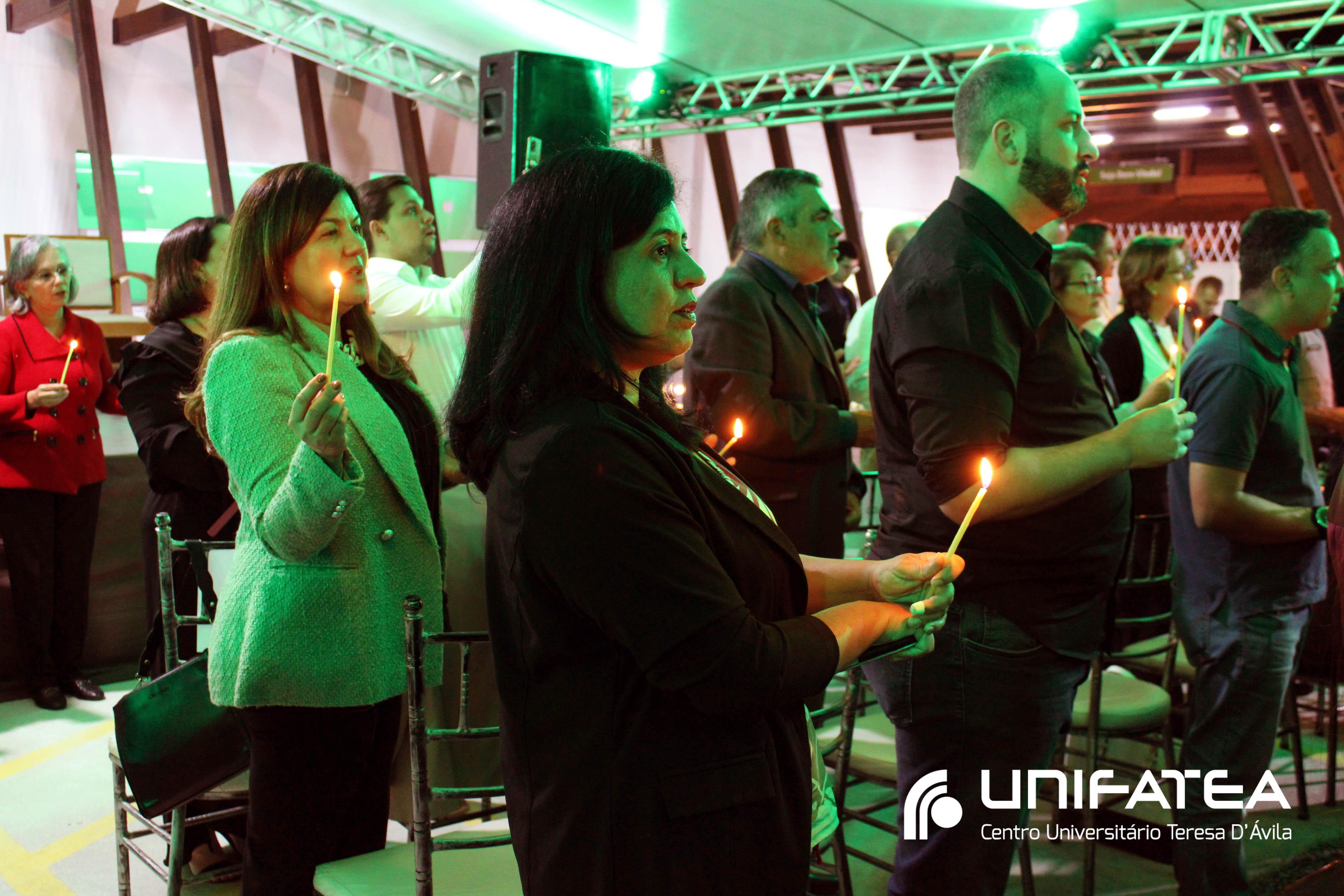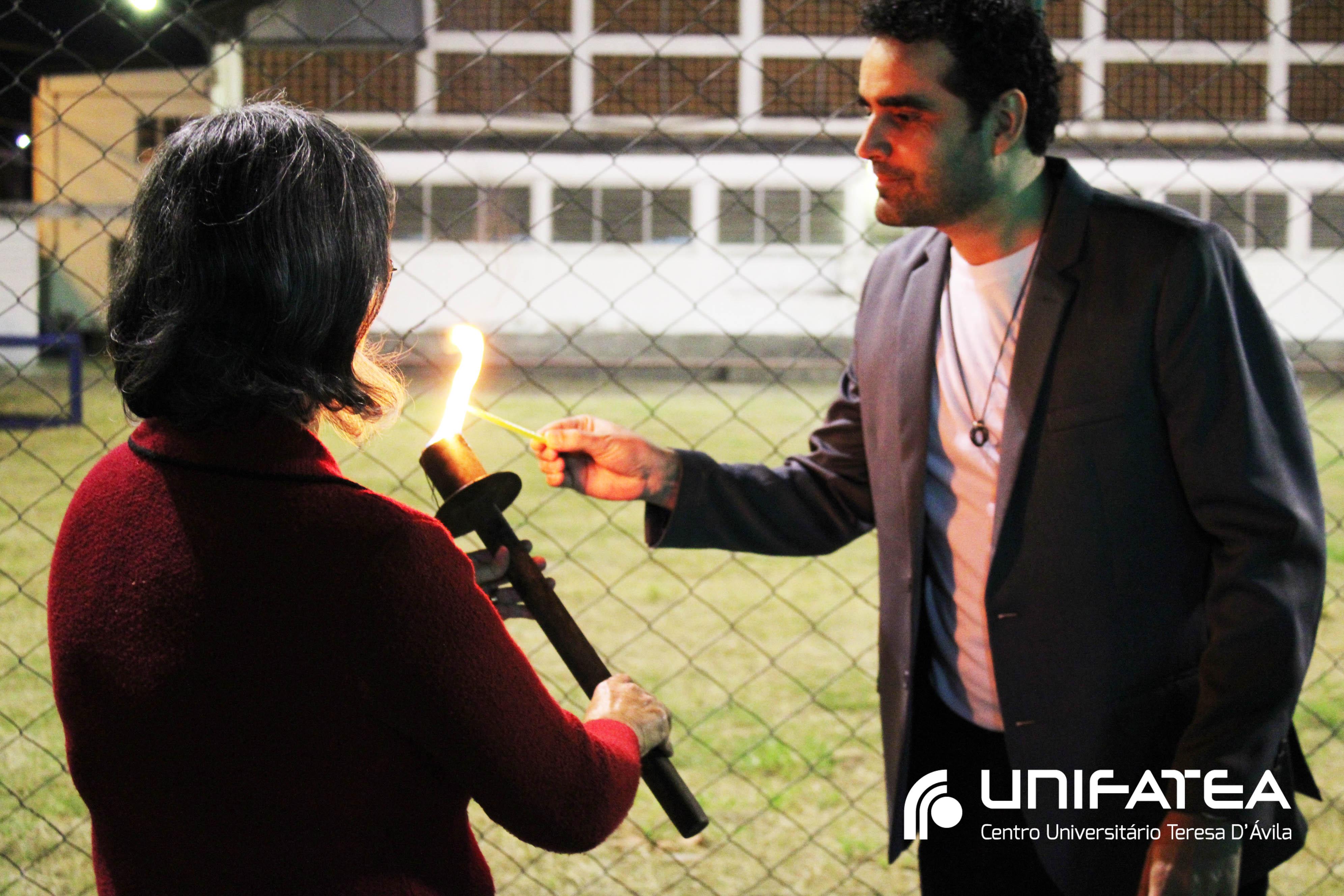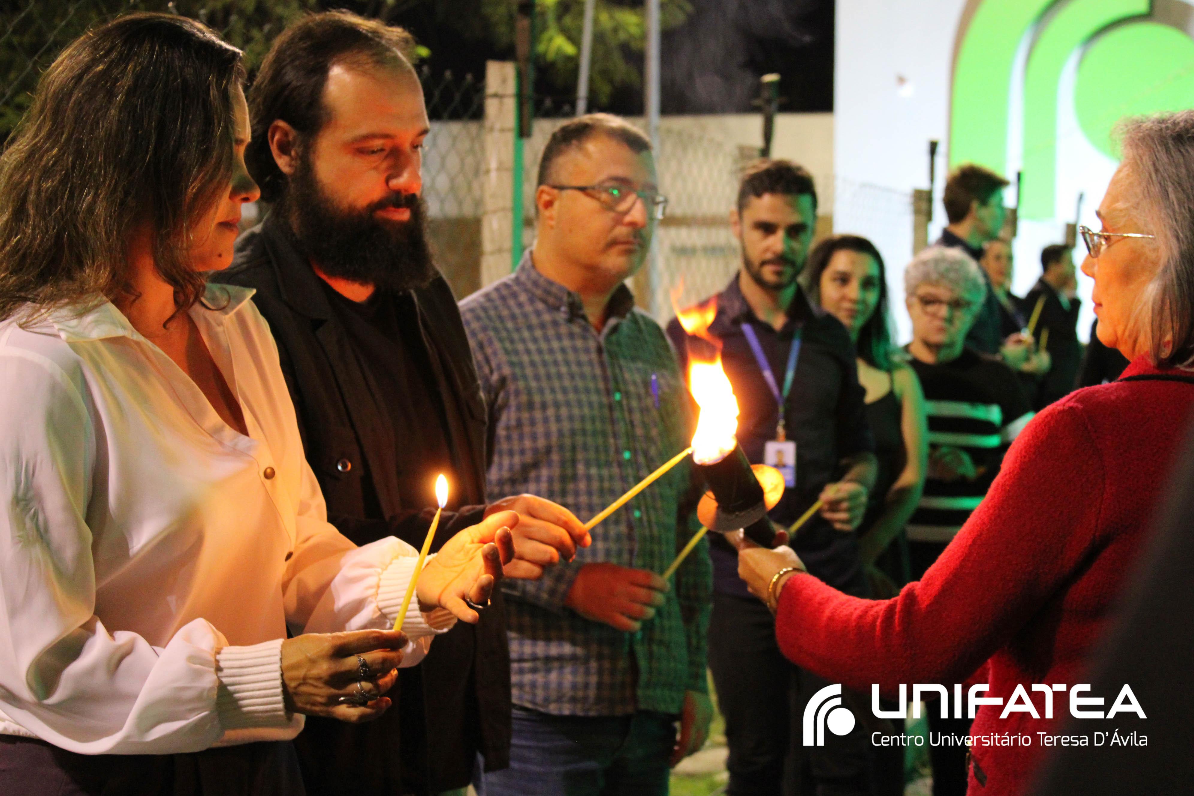 A tocha principal acendia diferentes tochas que representavam os outros 11 cursos de graduação do Unifatea, que forma profissionais para a região e que atuam em todo o Brasil e fora dele, há mais de 60 anos. Também acendeu outras velas que foram, paulatinamente, iluminando todo o espaço com as velas entregas aos presentes. Irmã Zenilde então, conduziu uma oração, pedindo a todos que voltassem seus olhares para a imagem de Nossa Senhora Auxiliadora que fica posicionada na entrada da Clínica-escola. As orações foram pela cura de todos que passassem pelas portas da Clínica e pelos projetos individuais de cada um, que está viva em seus corações.