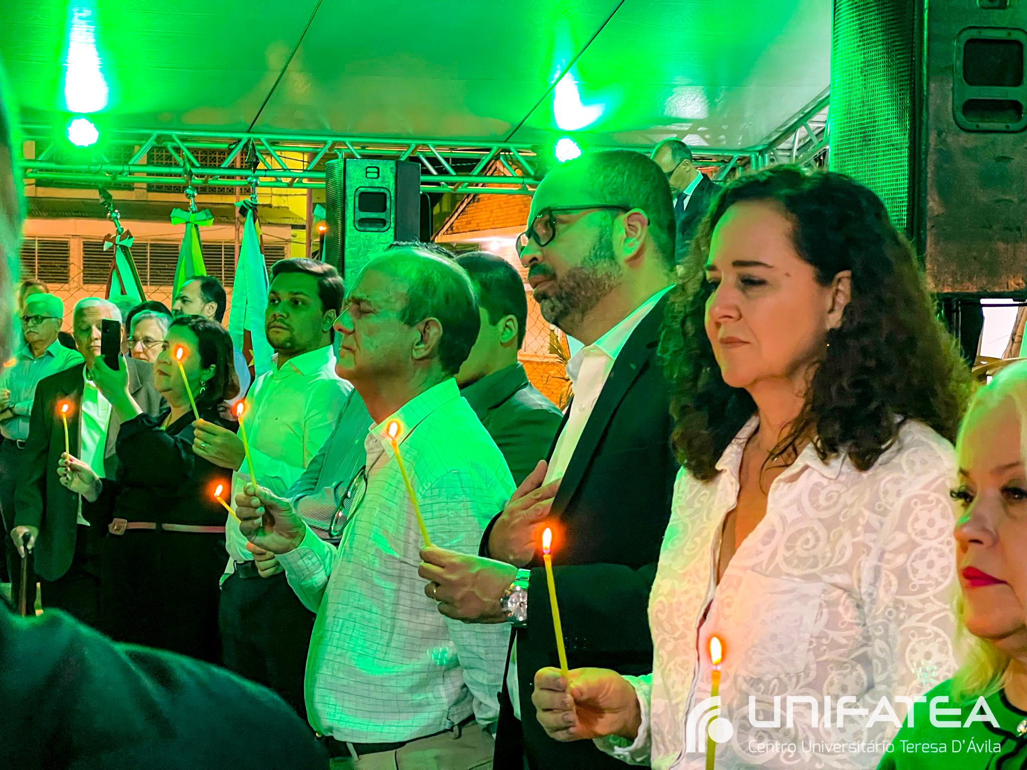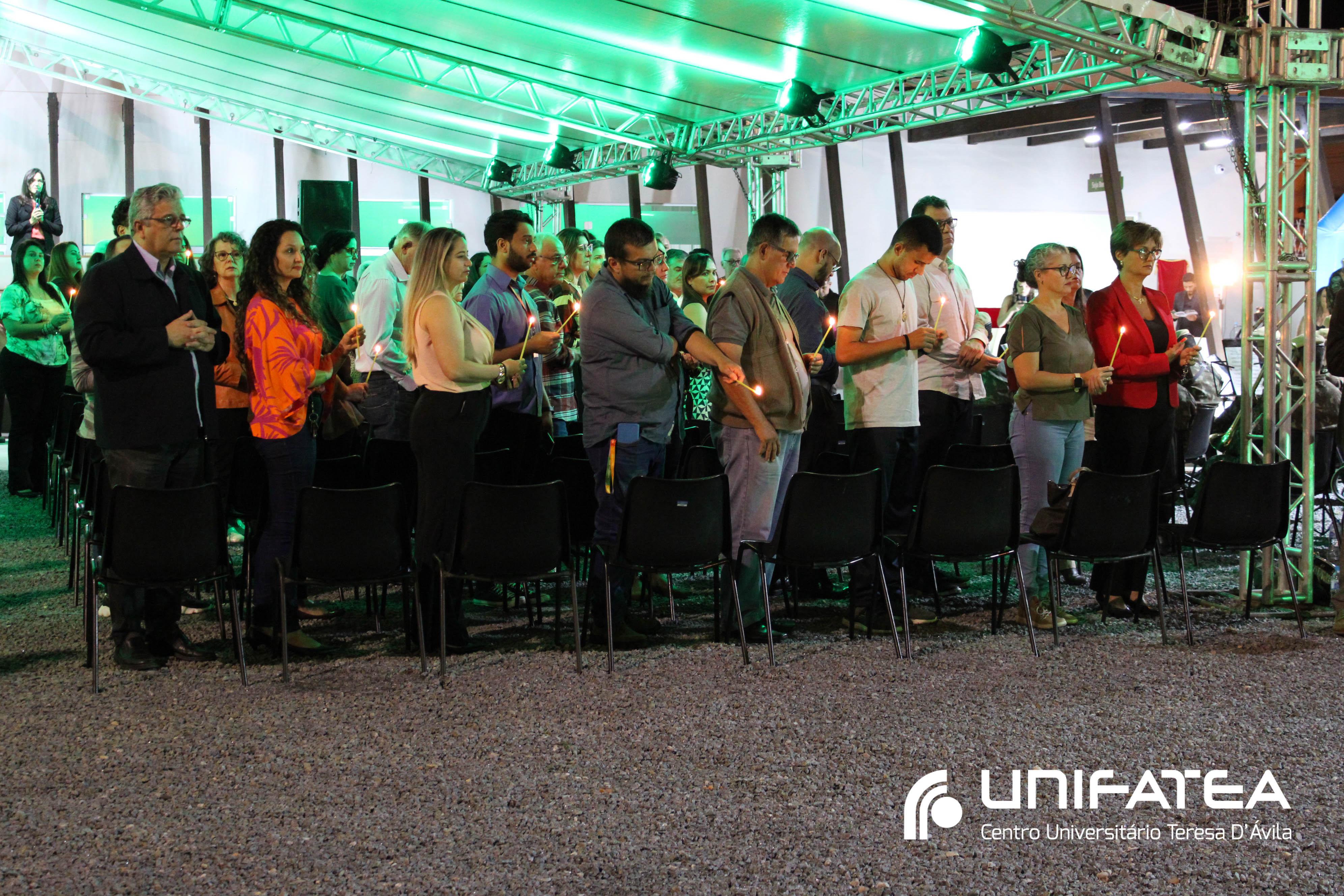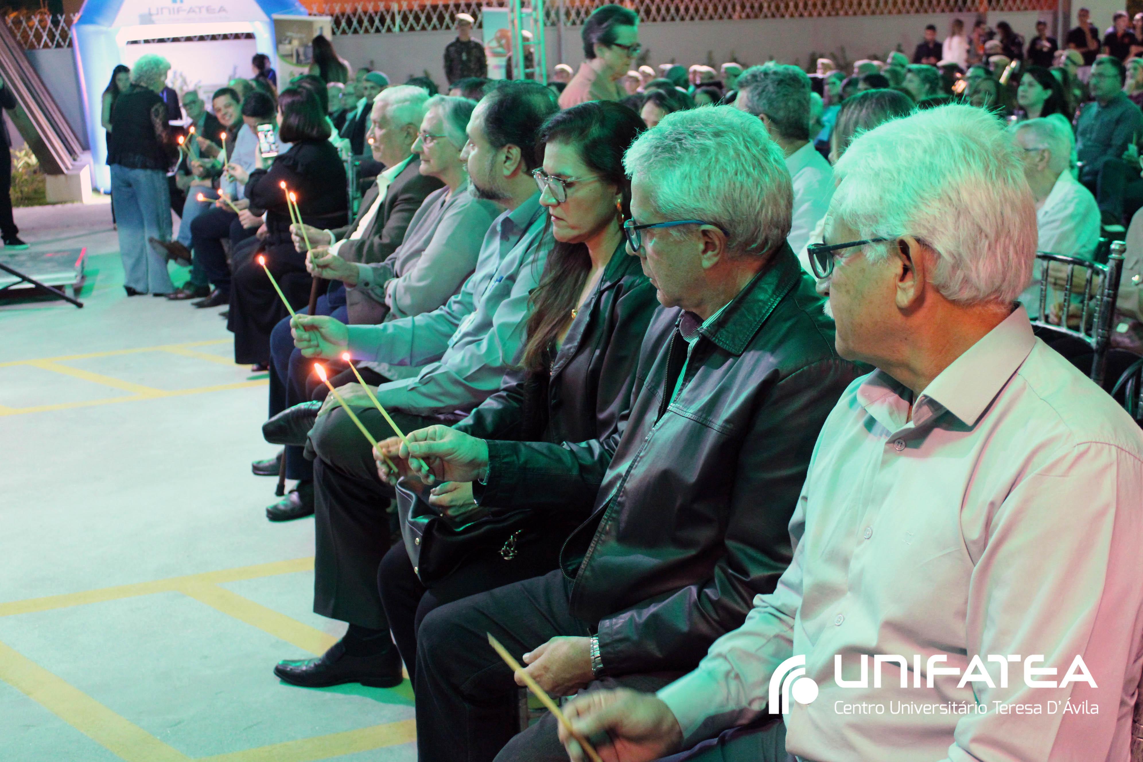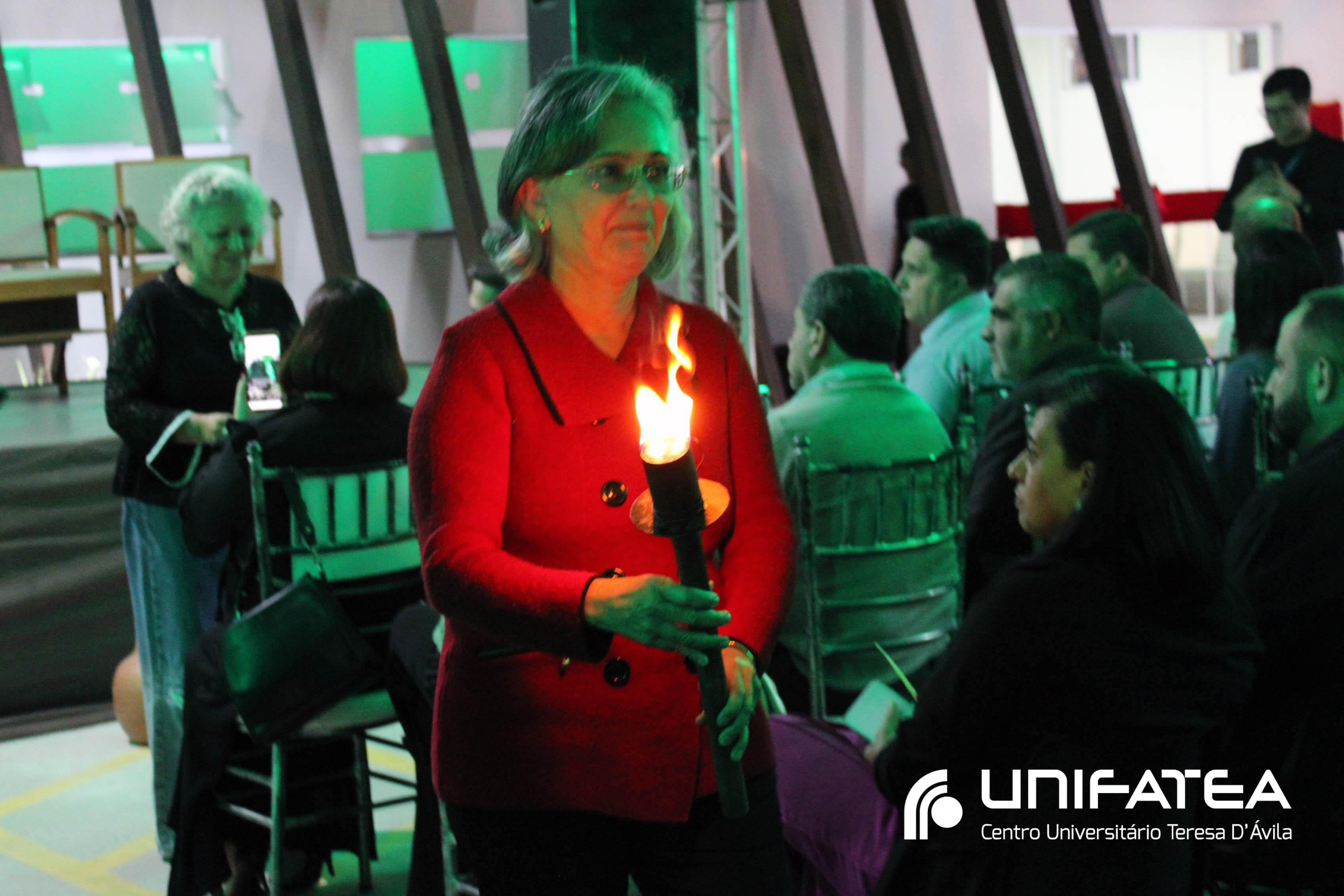 A tocha principal acendia diferentes tochas que representavam os outros 11 cursos de graduação do Unifatea, que forma profissionais para a região e que atuam em todo o Brasil e fora dele, há mais de 60 anos. Também acendeu outras velas que foram, paulatinamente, iluminando todo o espaço com as velas entregas aos presentes. Irmã Zenilde então, conduziu uma oração, pedindo a todos que voltassem seus olhares para a imagem de Nossa Senhora Auxiliadora que fica posicionada na entrada da Clínica-escola. As orações foram pela cura de todos que passassem pelas portas da Clínica e pelos projetos individuais de cada um, que está viva em seus corações.