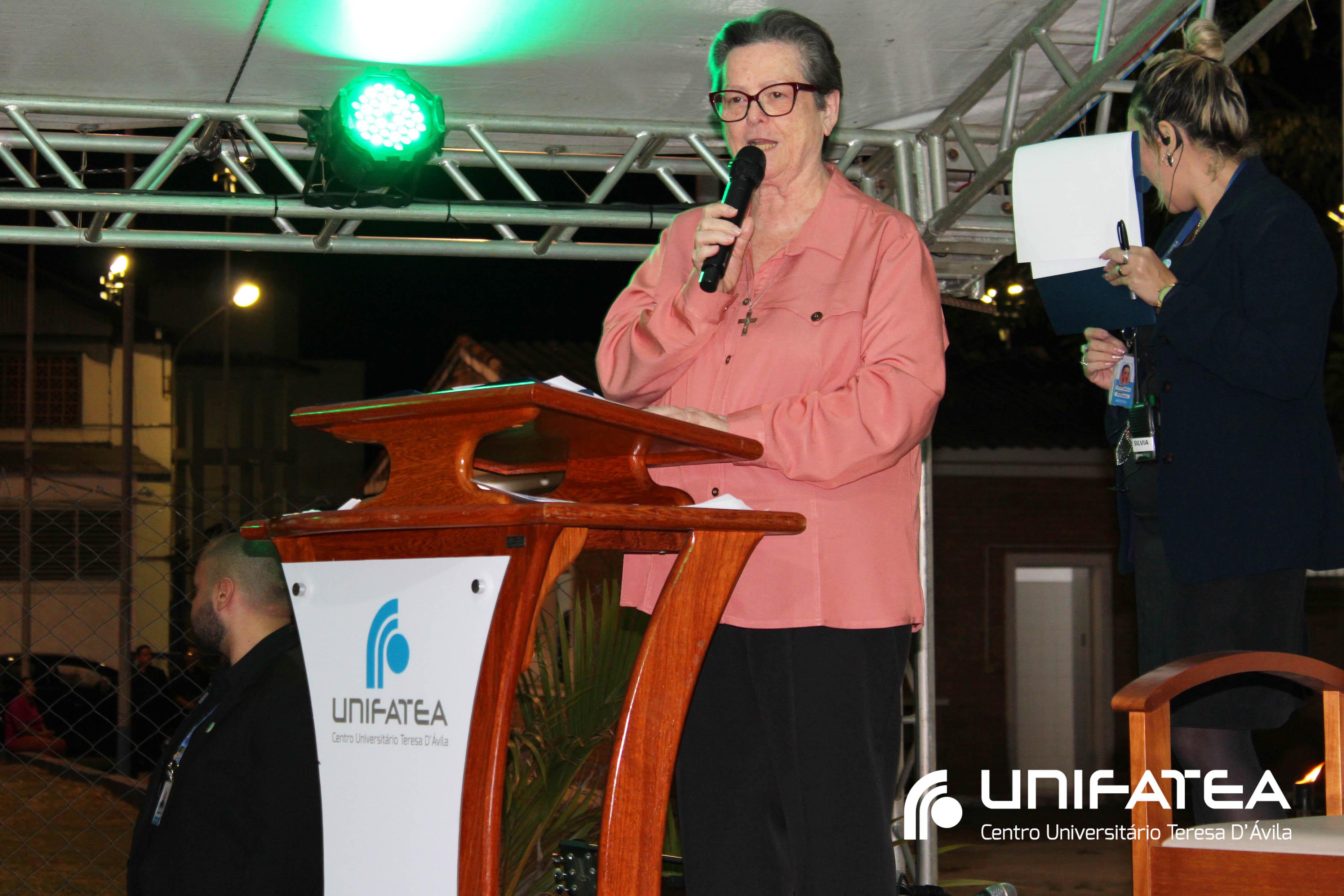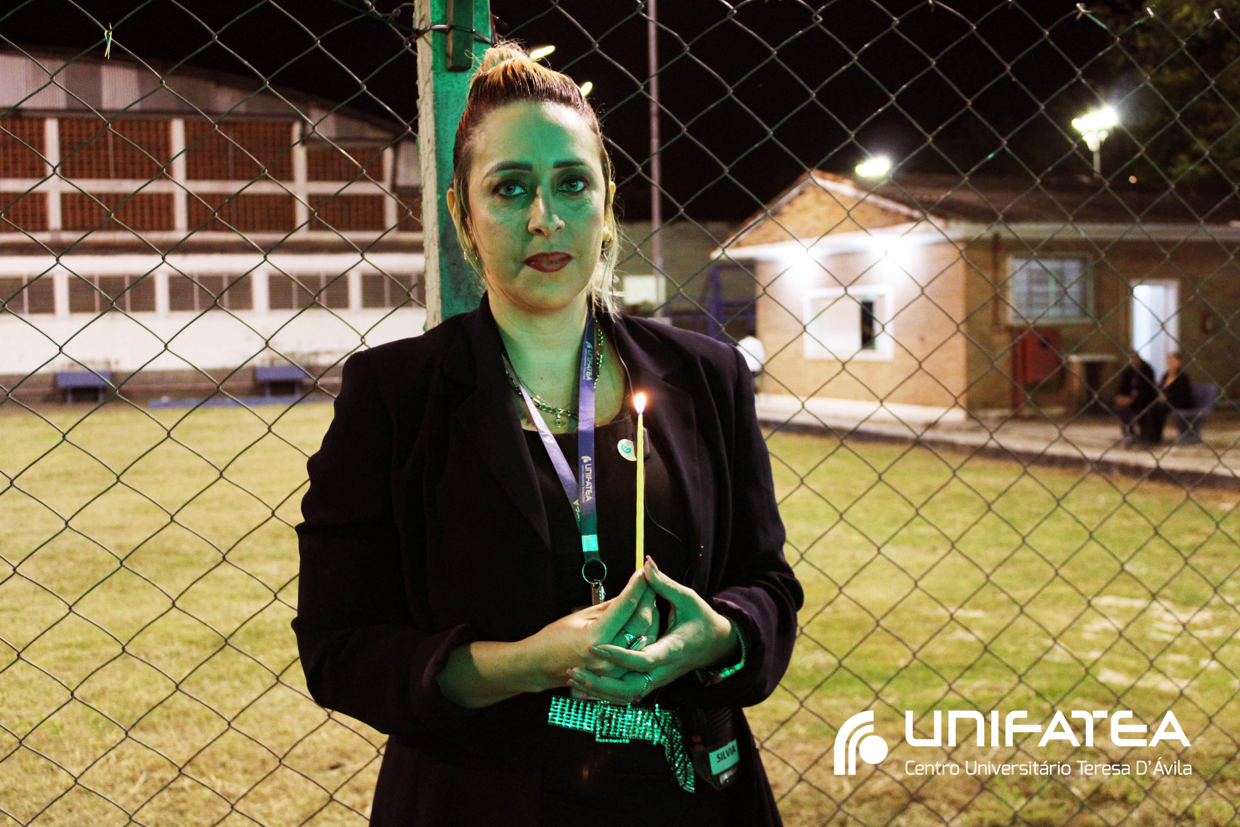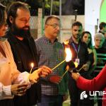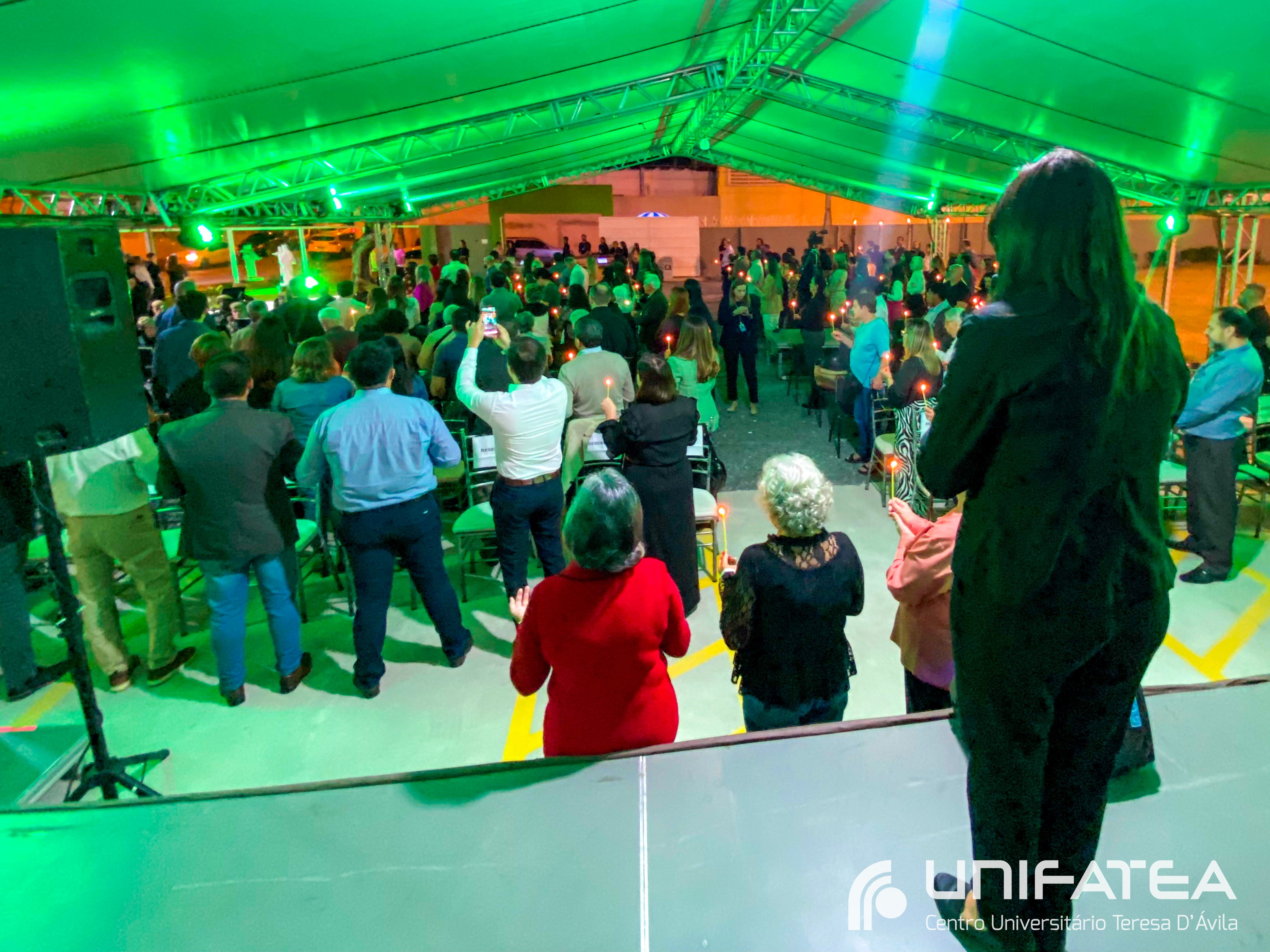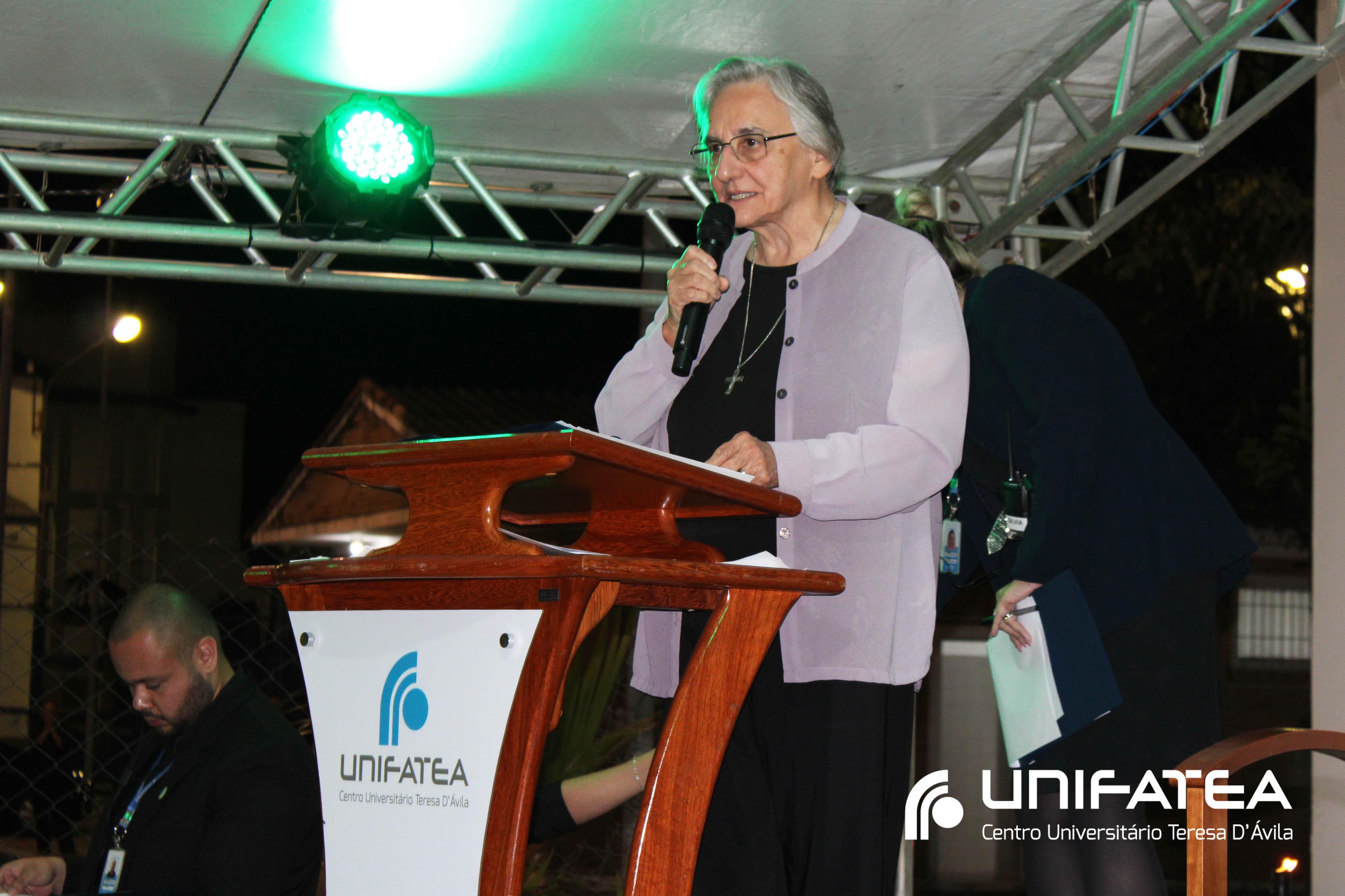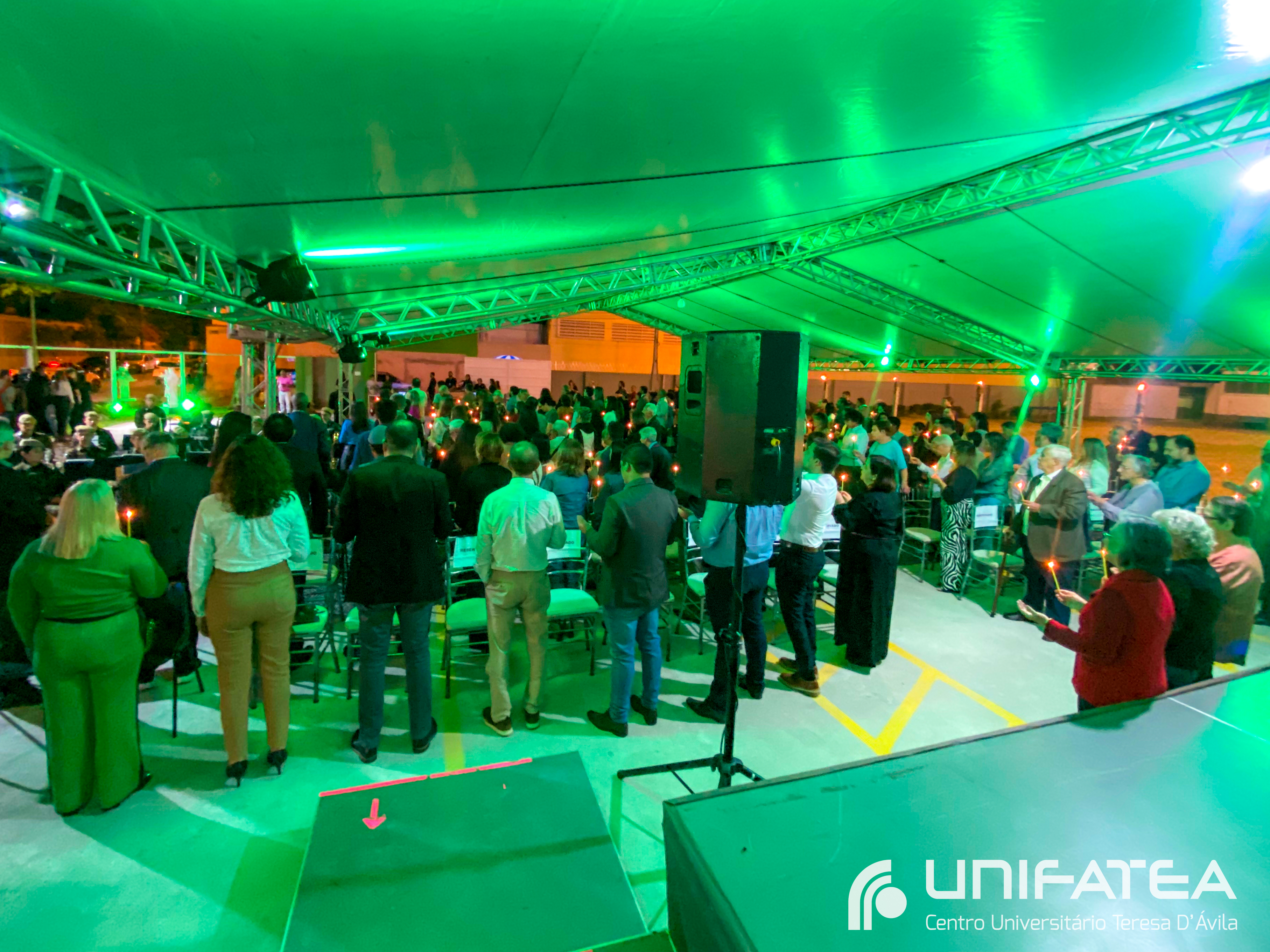 A tocha principal acendia diferentes tochas que representavam os outros 11 cursos de graduação do Unifatea, que forma profissionais para a região e que atuam em todo o Brasil e fora dele, há mais de 60 anos. Também acendeu outras velas que foram, paulatinamente, iluminando todo o espaço com as velas entregas aos presentes. Irmã Zenilde então, conduziu uma oração, pedindo a todos que voltassem seus olhares para a imagem de Nossa Senhora Auxiliadora que fica posicionada na entrada da Clínica-escola. As orações foram pela cura de todos que passassem pelas portas da Clínica e pelos projetos individuais de cada um, que está viva em seus corações.
