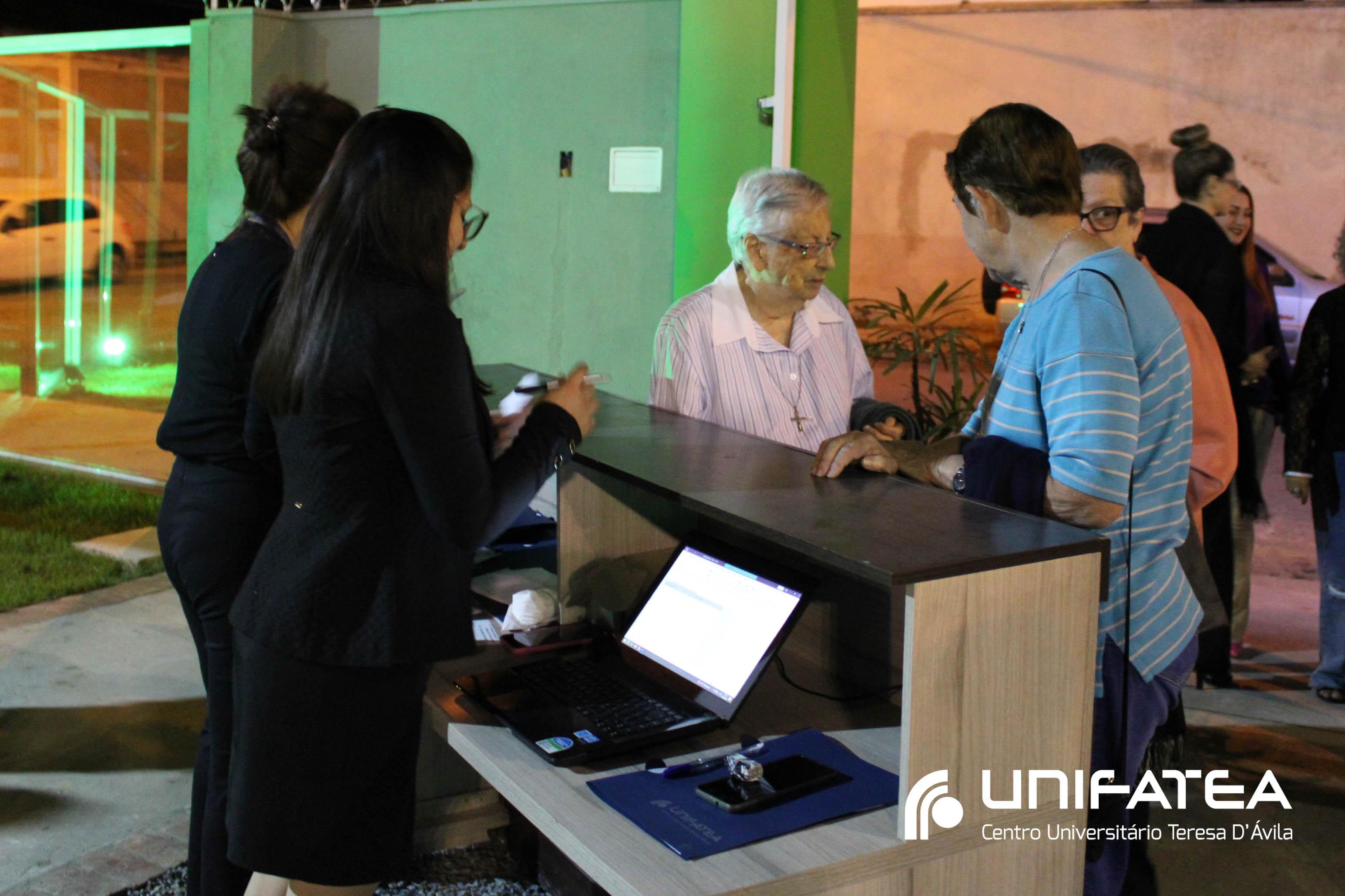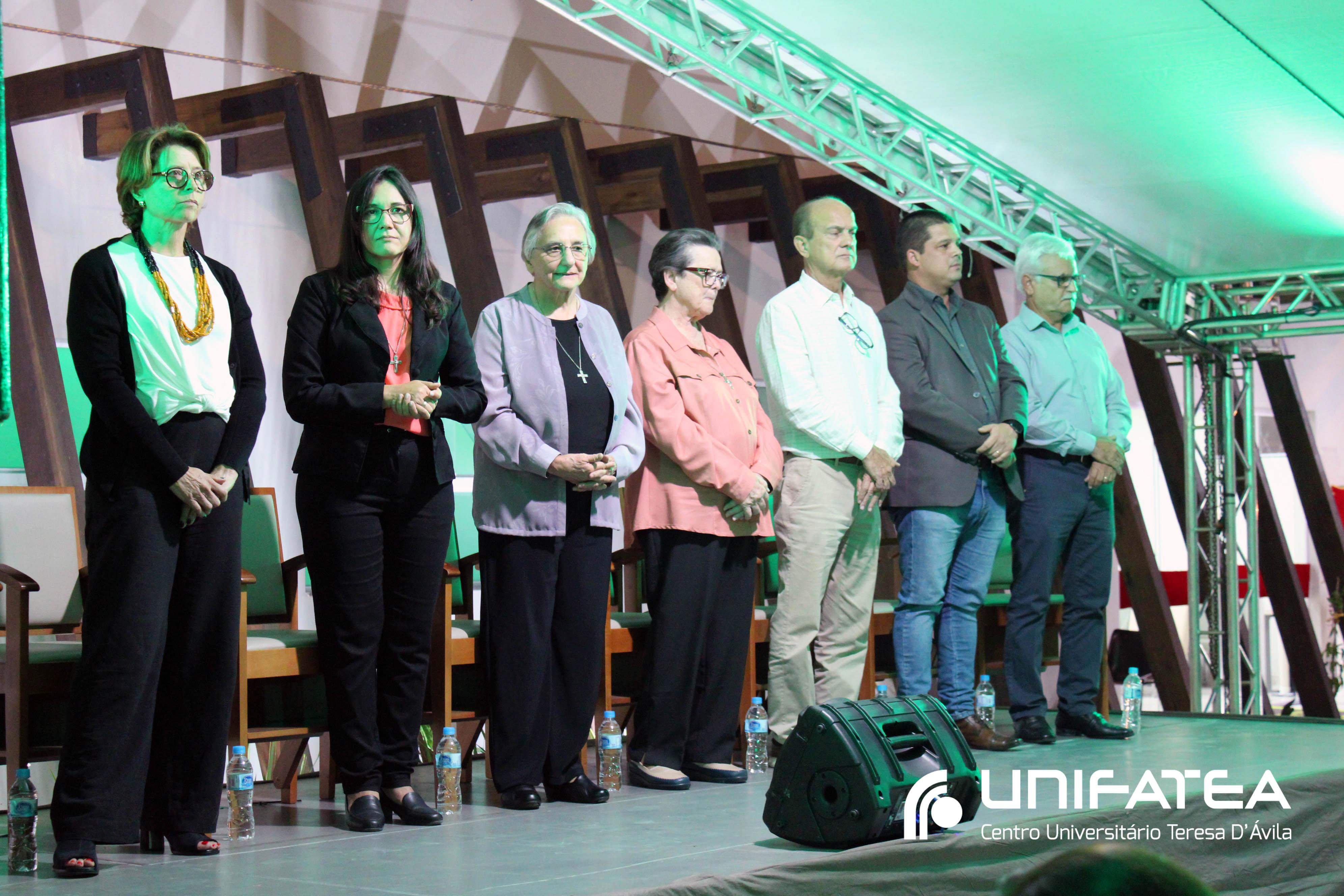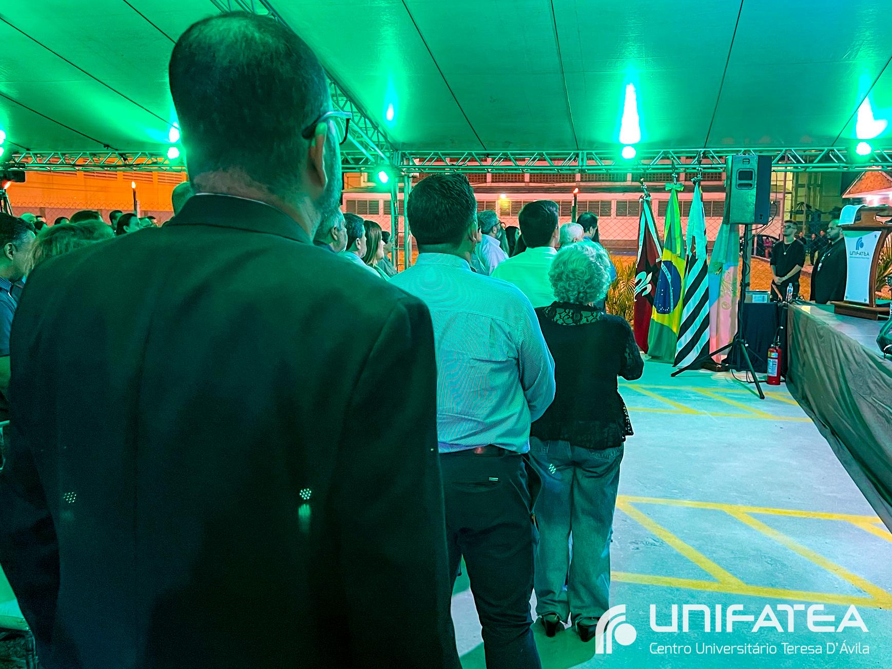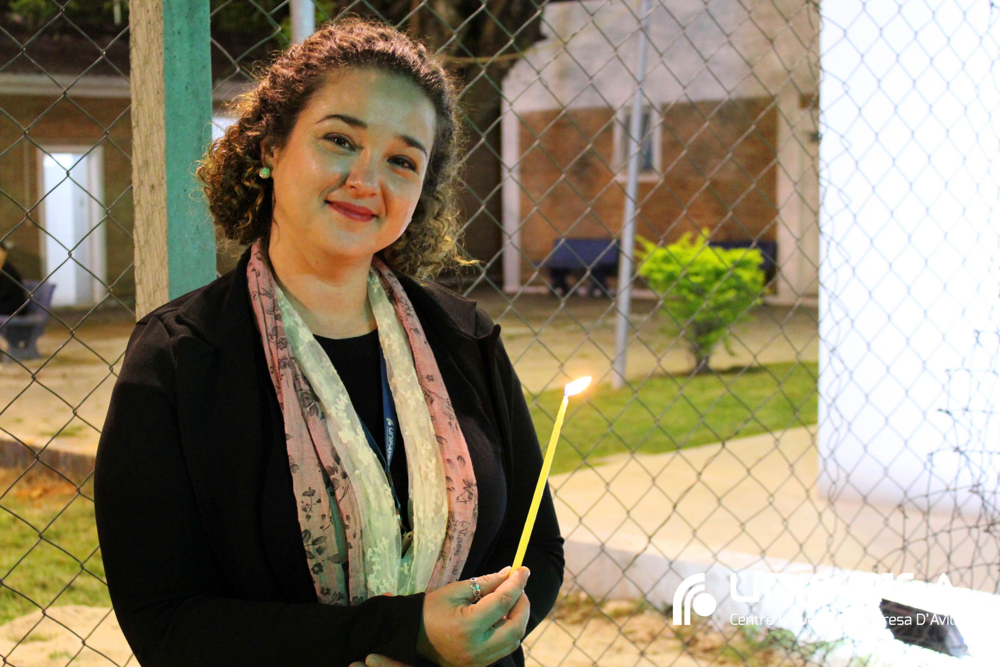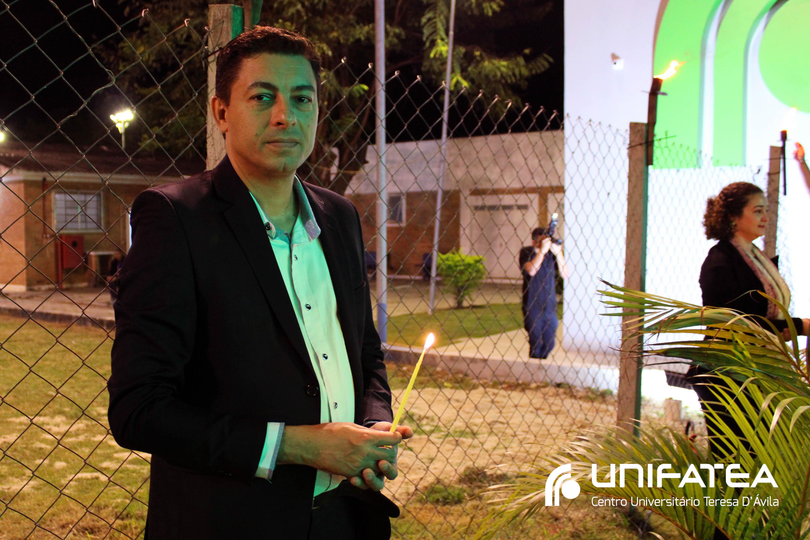 A tocha principal acendia diferentes tochas que representavam os outros 11 cursos de graduação do Unifatea, que forma profissionais para a região e que atuam em todo o Brasil e fora dele, há mais de 60 anos. Também acendeu outras velas que foram, paulatinamente, iluminando todo o espaço com as velas entregas aos presentes. Irmã Zenilde então, conduziu uma oração, pedindo a todos que voltassem seus olhares para a imagem de Nossa Senhora Auxiliadora que fica posicionada na entrada da Clínica-escola. As orações foram pela cura de todos que passassem pelas portas da Clínica e pelos projetos individuais de cada um, que está viva em seus corações.