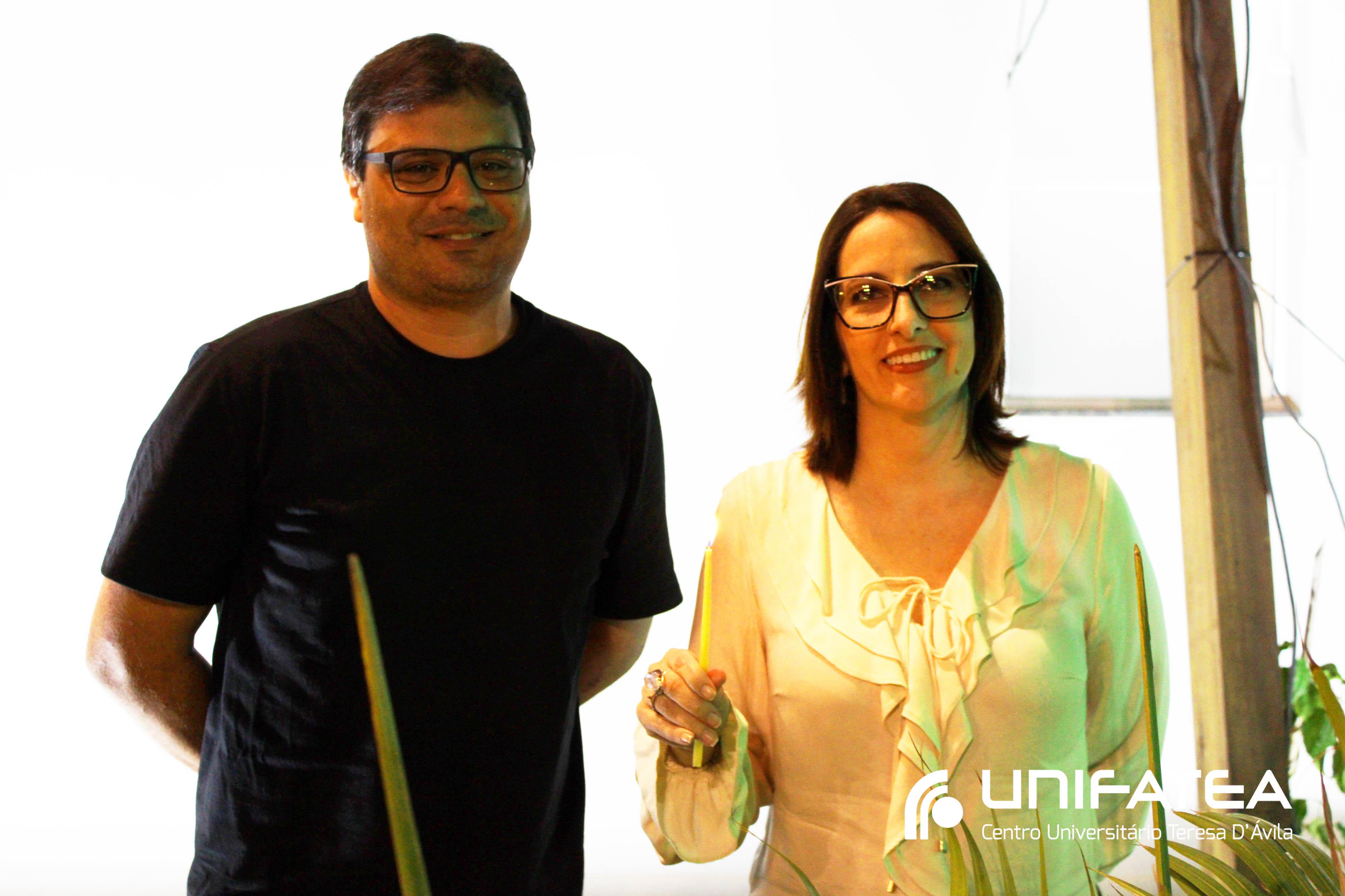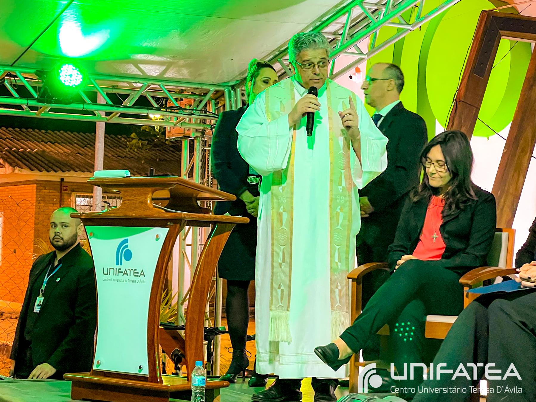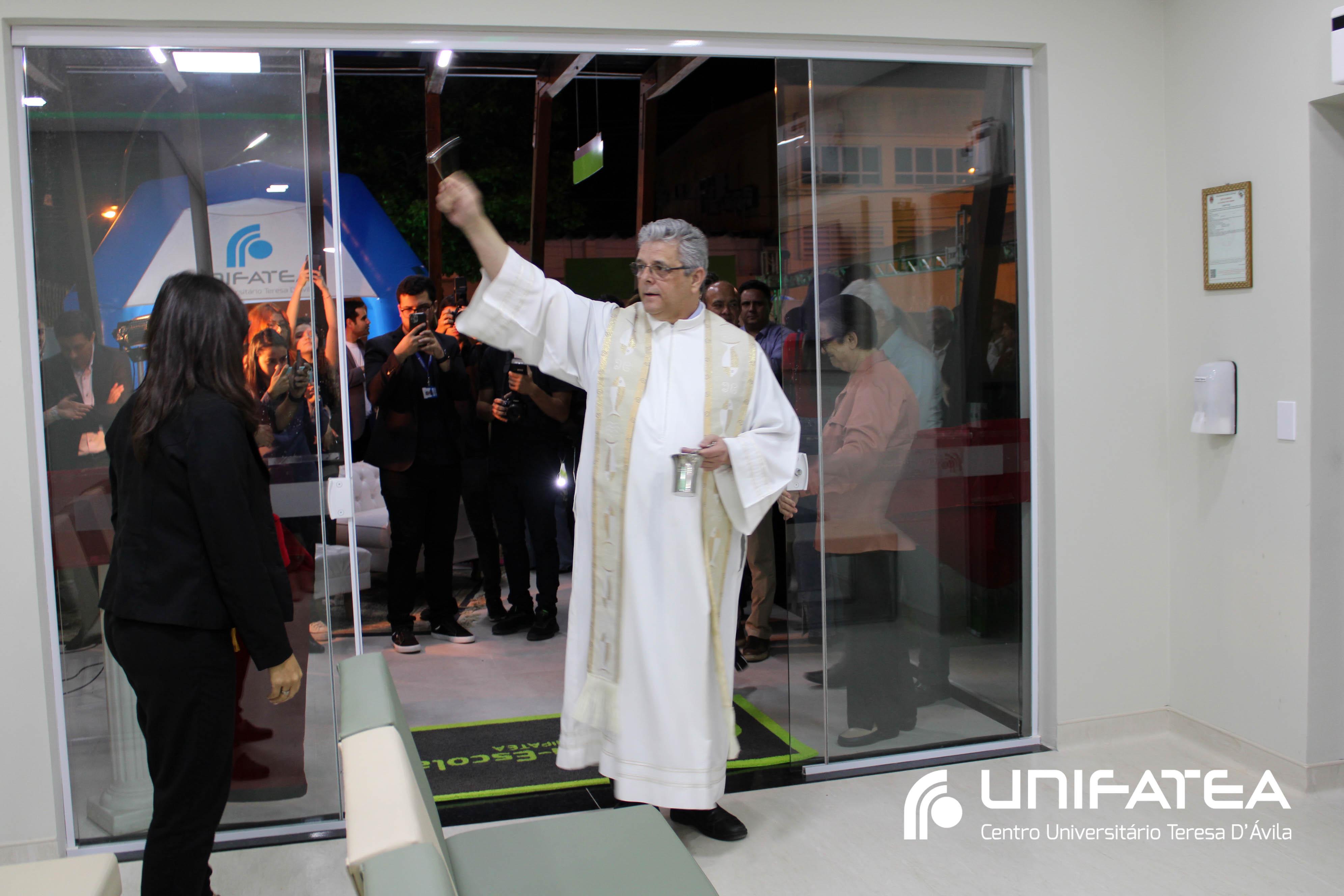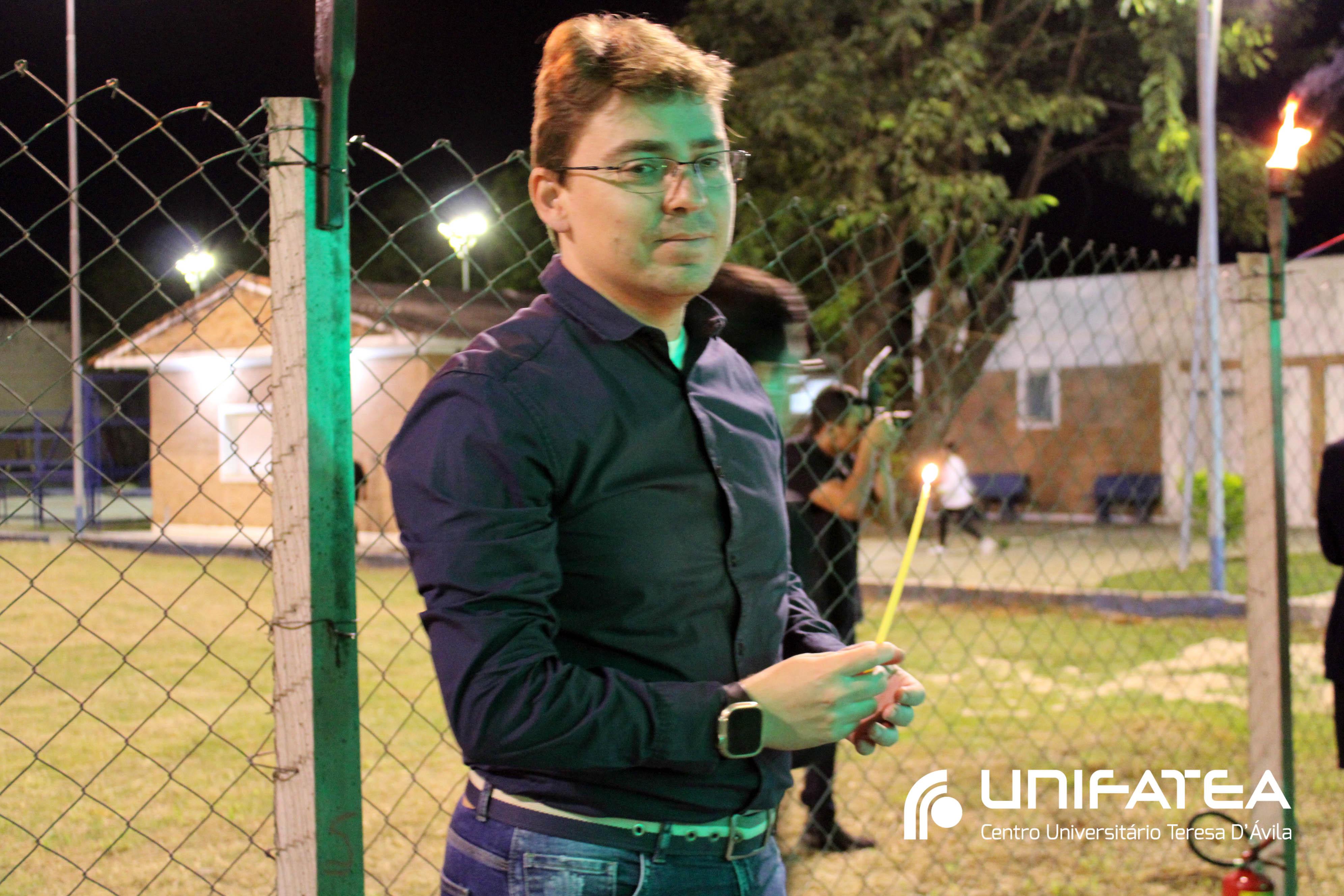 A tocha principal acendia diferentes tochas que representavam os outros 11 cursos de graduação do Unifatea, que forma profissionais para a região e que atuam em todo o Brasil e fora dele, há mais de 60 anos. Também acendeu outras velas que foram, paulatinamente, iluminando todo o espaço com as velas entregas aos presentes. Irmã Zenilde então, conduziu uma oração, pedindo a todos que voltassem seus olhares para a imagem de Nossa Senhora Auxiliadora que fica posicionada na entrada da Clínica-escola. As orações foram pela cura de todos que passassem pelas portas da Clínica e pelos projetos individuais de cada um, que está viva em seus corações.