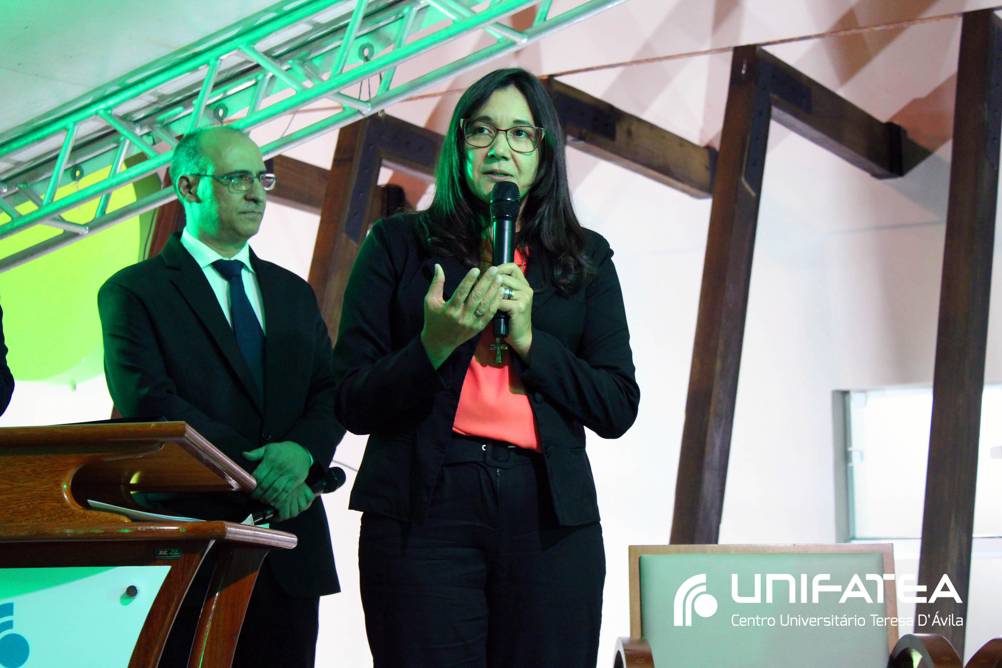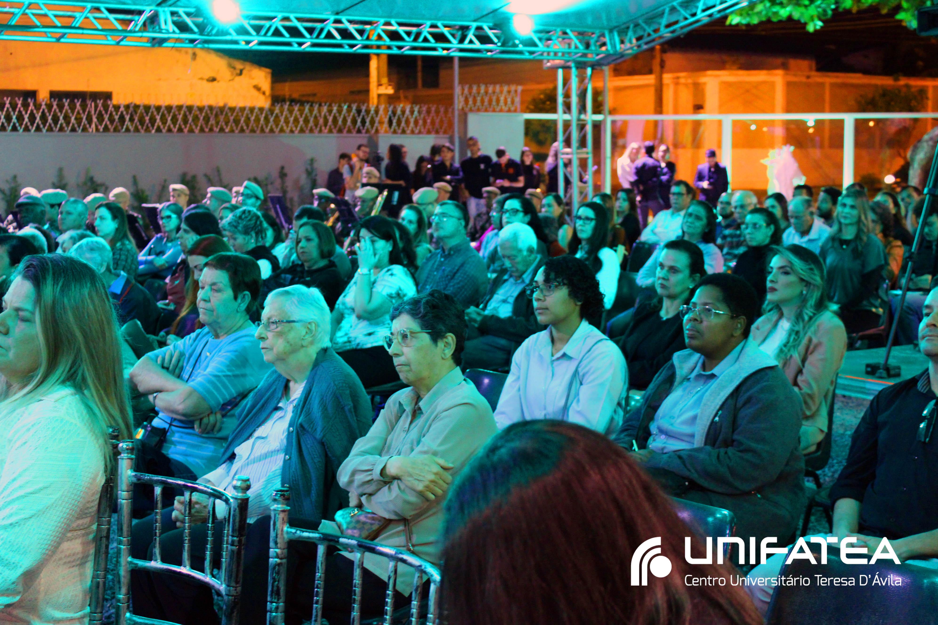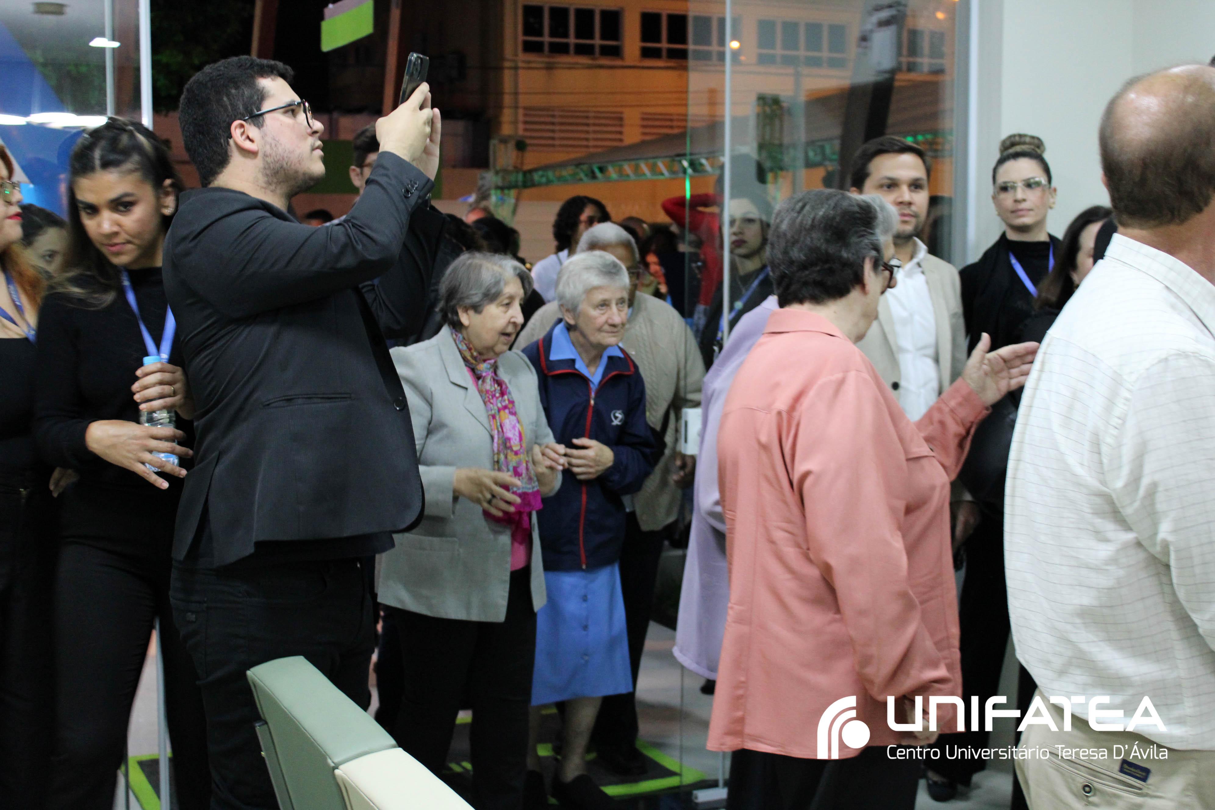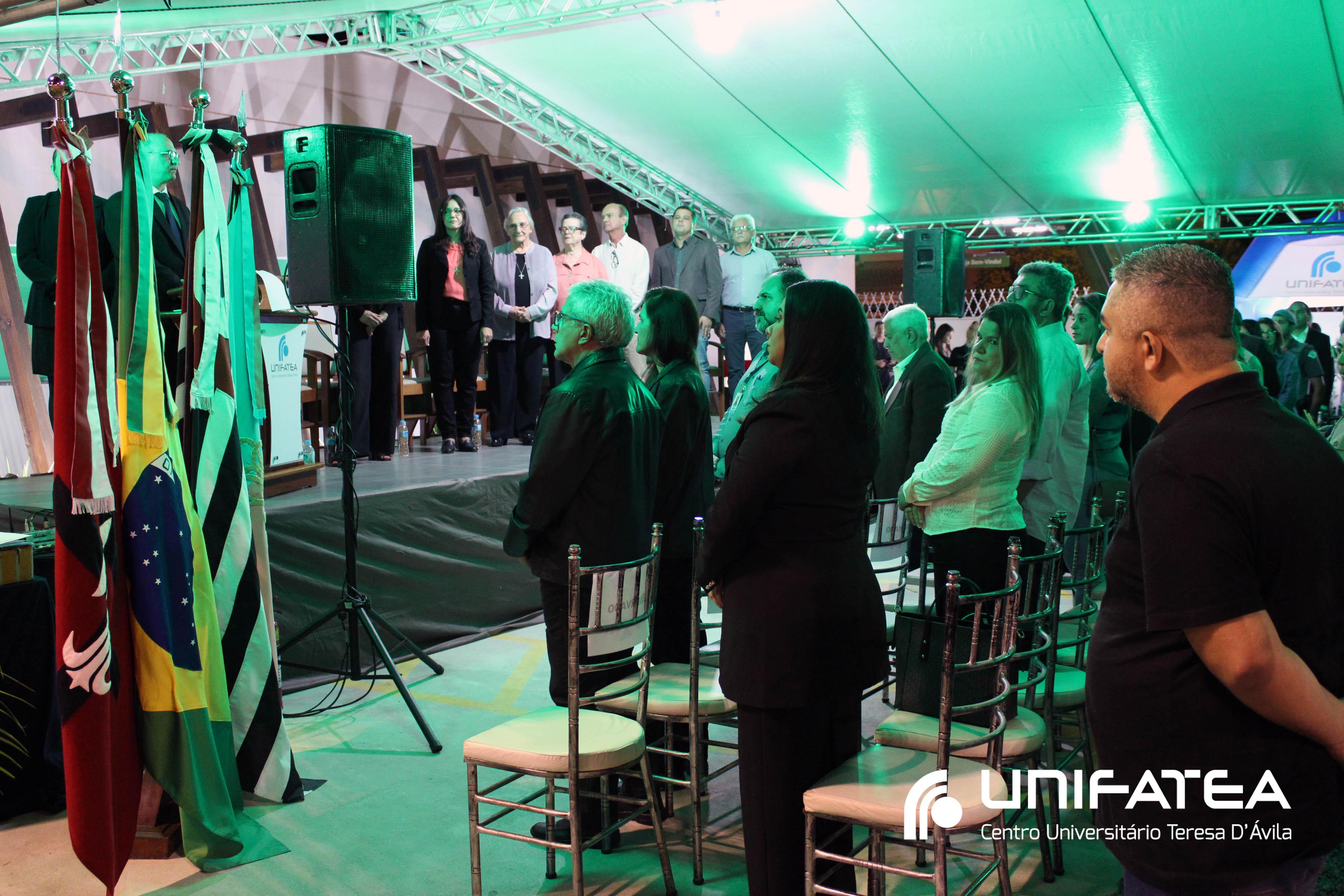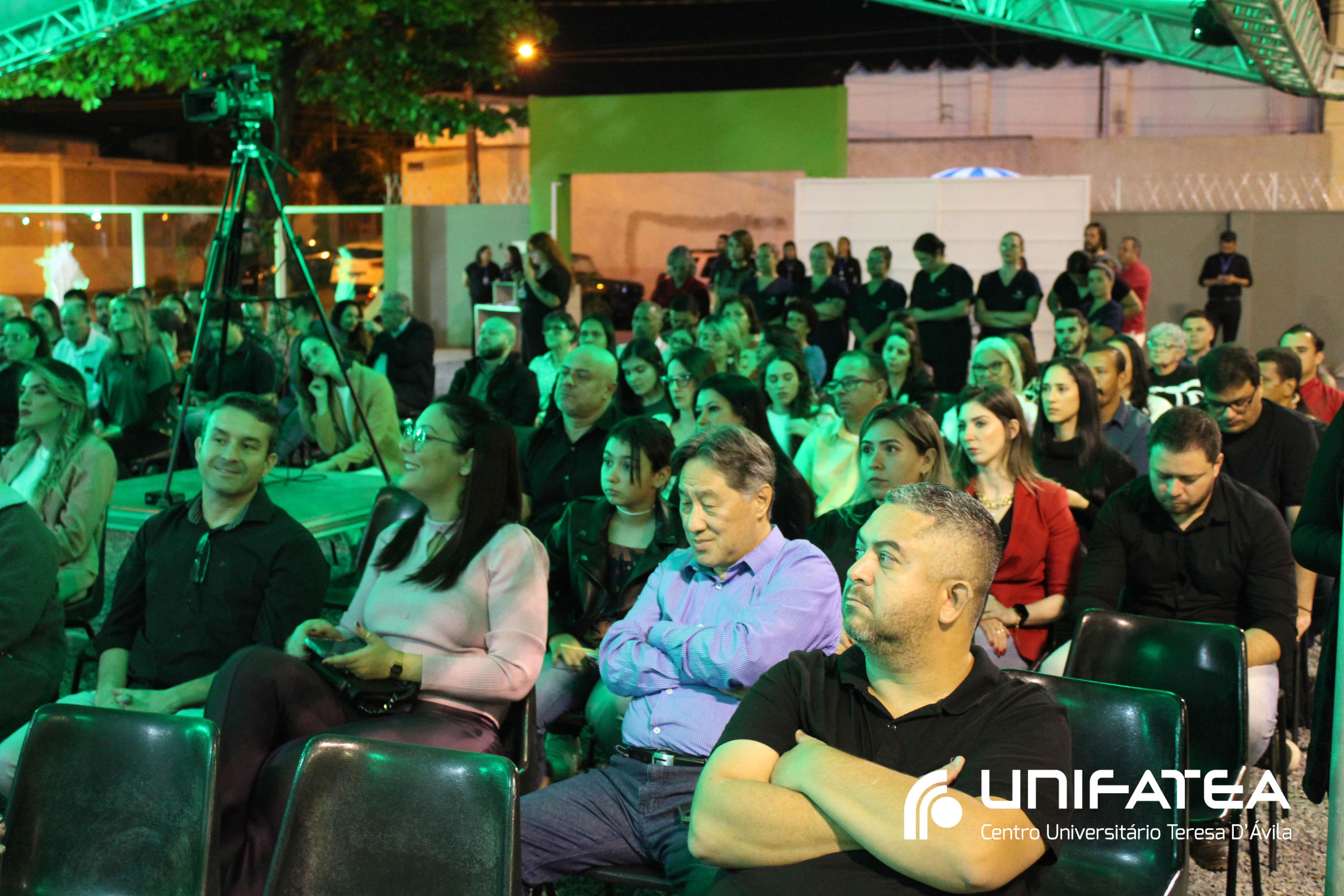 A tocha principal acendia diferentes tochas que representavam os outros 11 cursos de graduação do Unifatea, que forma profissionais para a região e que atuam em todo o Brasil e fora dele, há mais de 60 anos. Também acendeu outras velas que foram, paulatinamente, iluminando todo o espaço com as velas entregas aos presentes. Irmã Zenilde então, conduziu uma oração, pedindo a todos que voltassem seus olhares para a imagem de Nossa Senhora Auxiliadora que fica posicionada na entrada da Clínica-escola. As orações foram pela cura de todos que passassem pelas portas da Clínica e pelos projetos individuais de cada um, que está viva em seus corações.