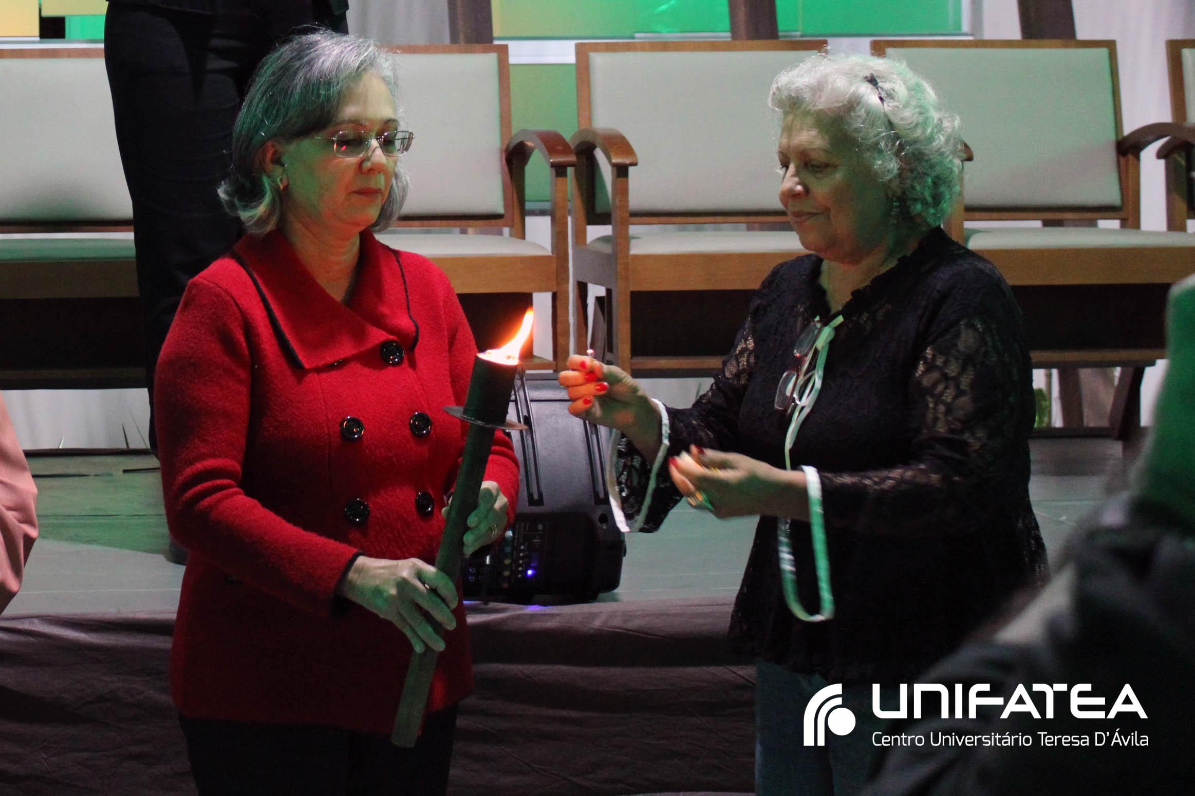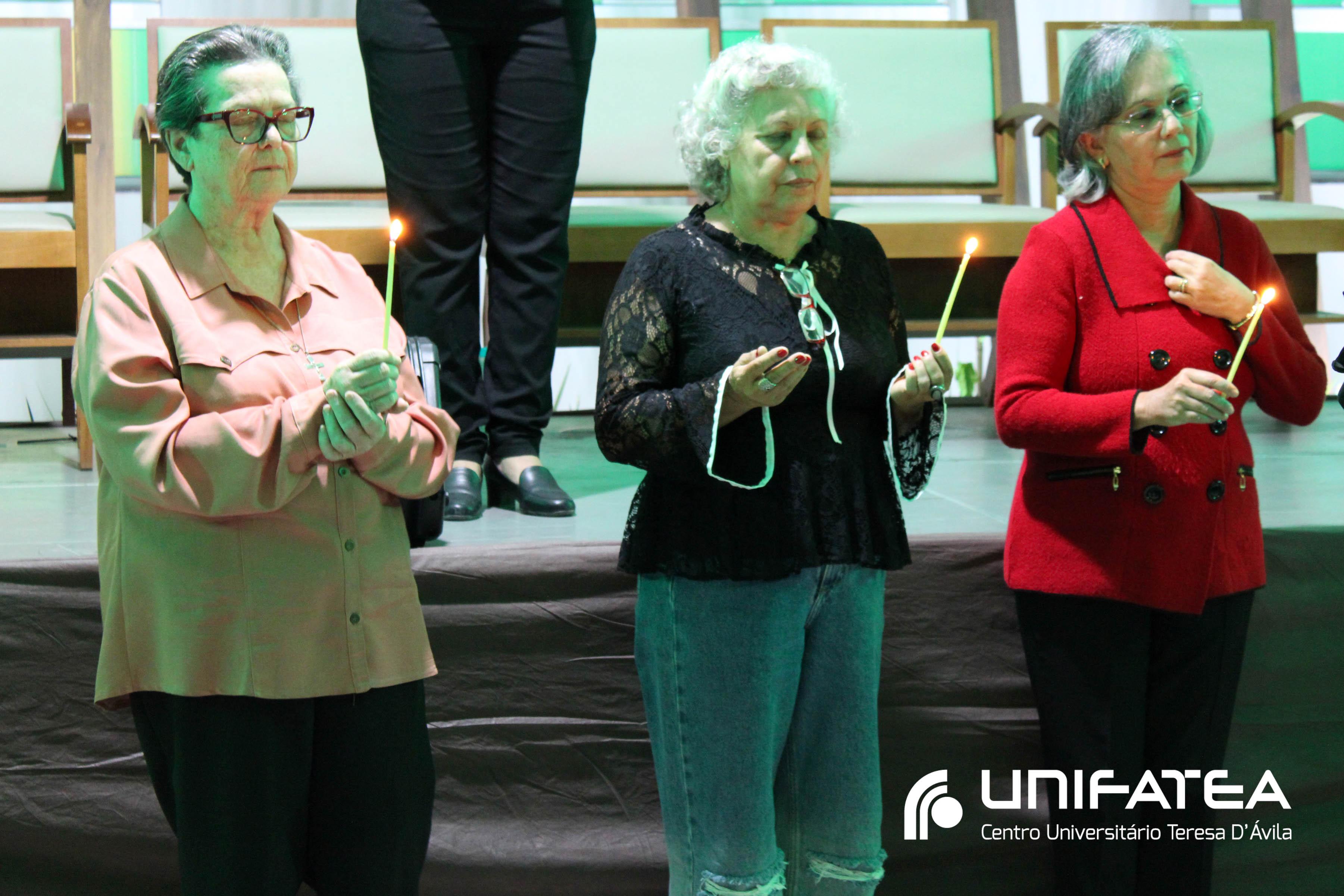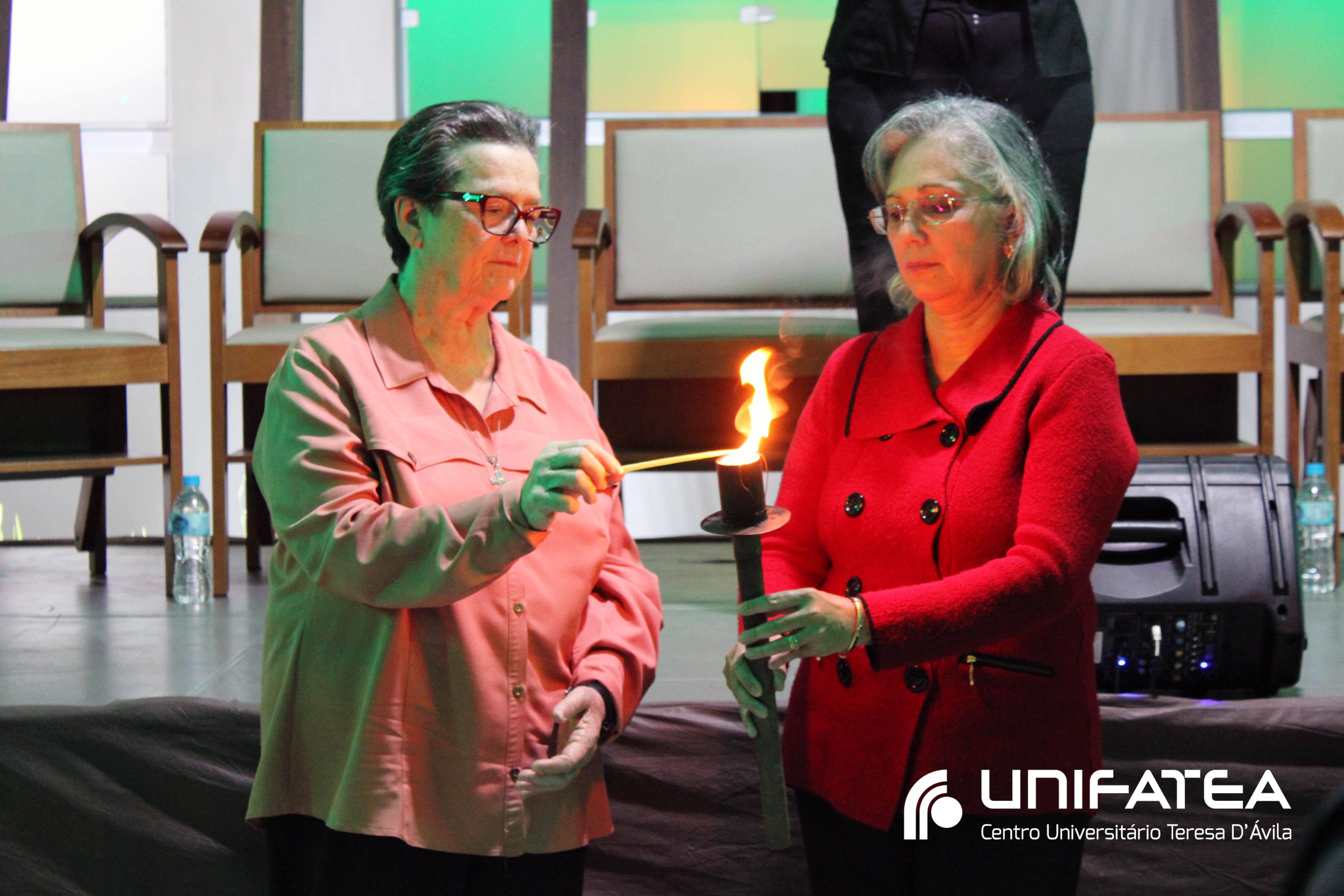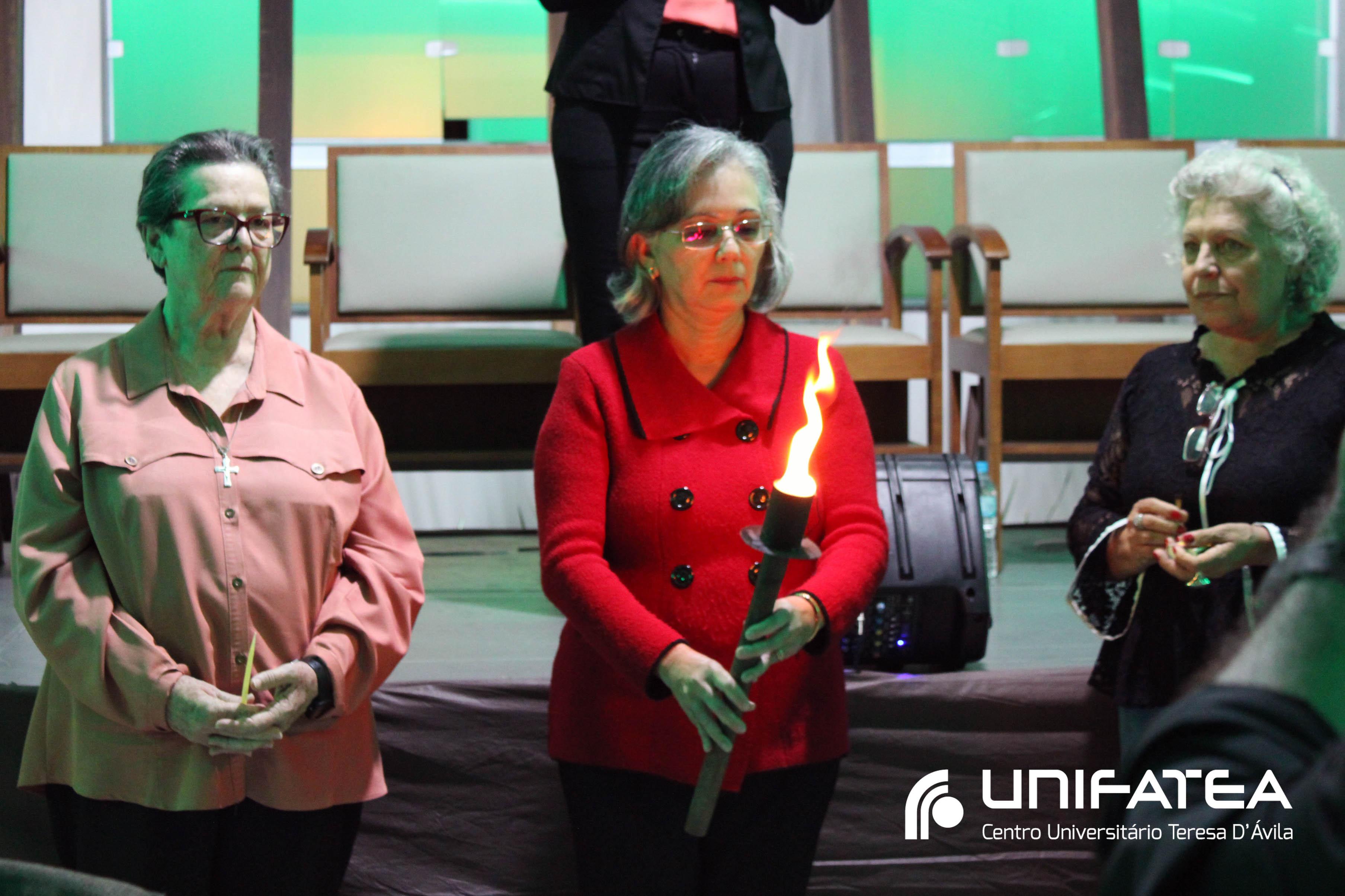 Buscando resgatar a memória histórica da enfermagem no Centro e o empenho no cuidado humanizado oferecido na clínica-escola, a cerimônia teve início com o momento das luzes. Uma tocha representando o cuidado e a vida, acima de tudo, foi acesa por mulheres que fizeram história na Clínica-escola: professora Regina Célia, quem iniciou o projeto do Ambulatório de Enfermagem, Irmã Célia, Filha de Maria Auxiliadora lembrando o trabalho das religiosas e de irmã Olga quem dirigia o Unifatea no período, e professora Ana Beatriz, coordenadora do curso de enfermagem e que participou das diferentes fases da Clínica-escola.