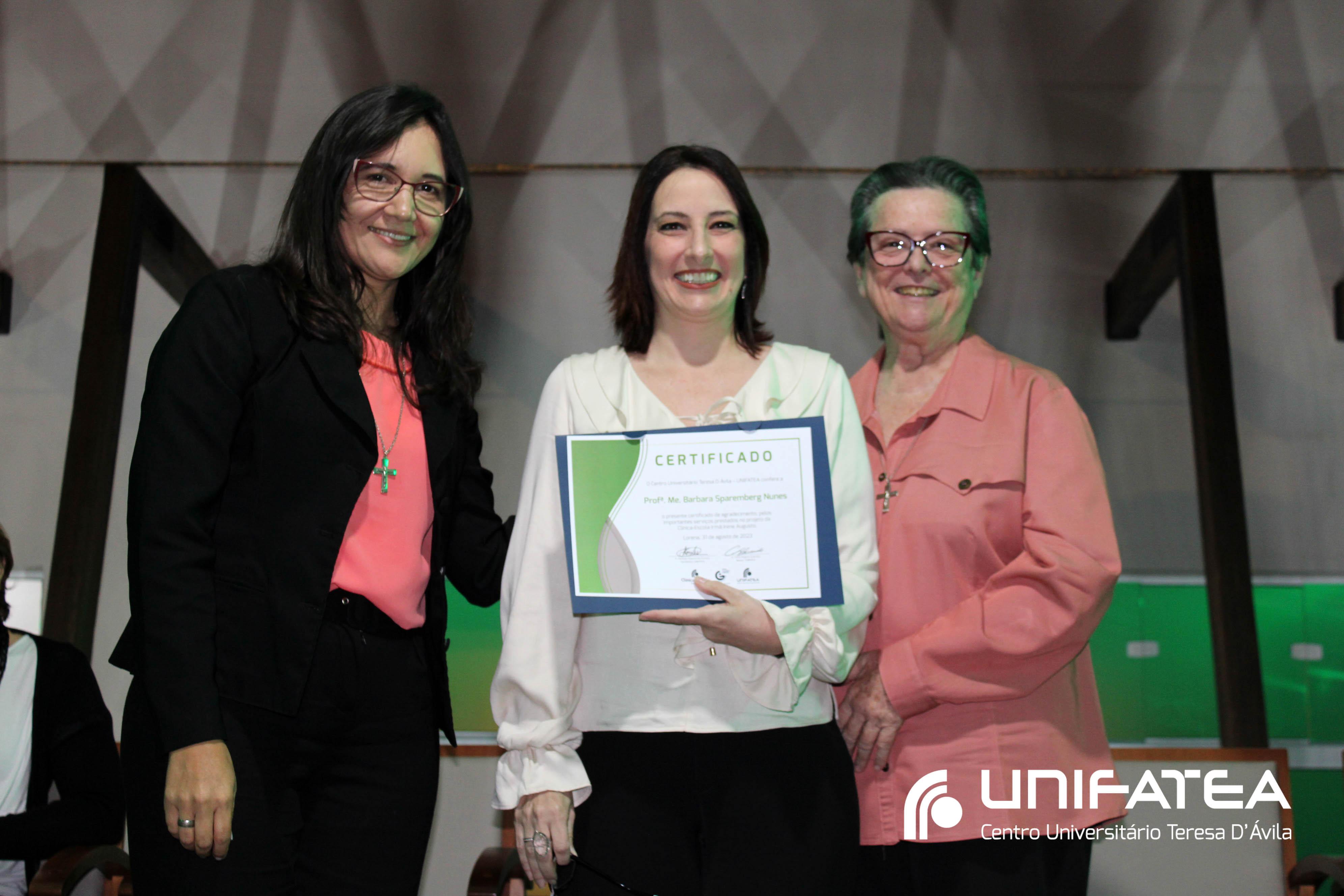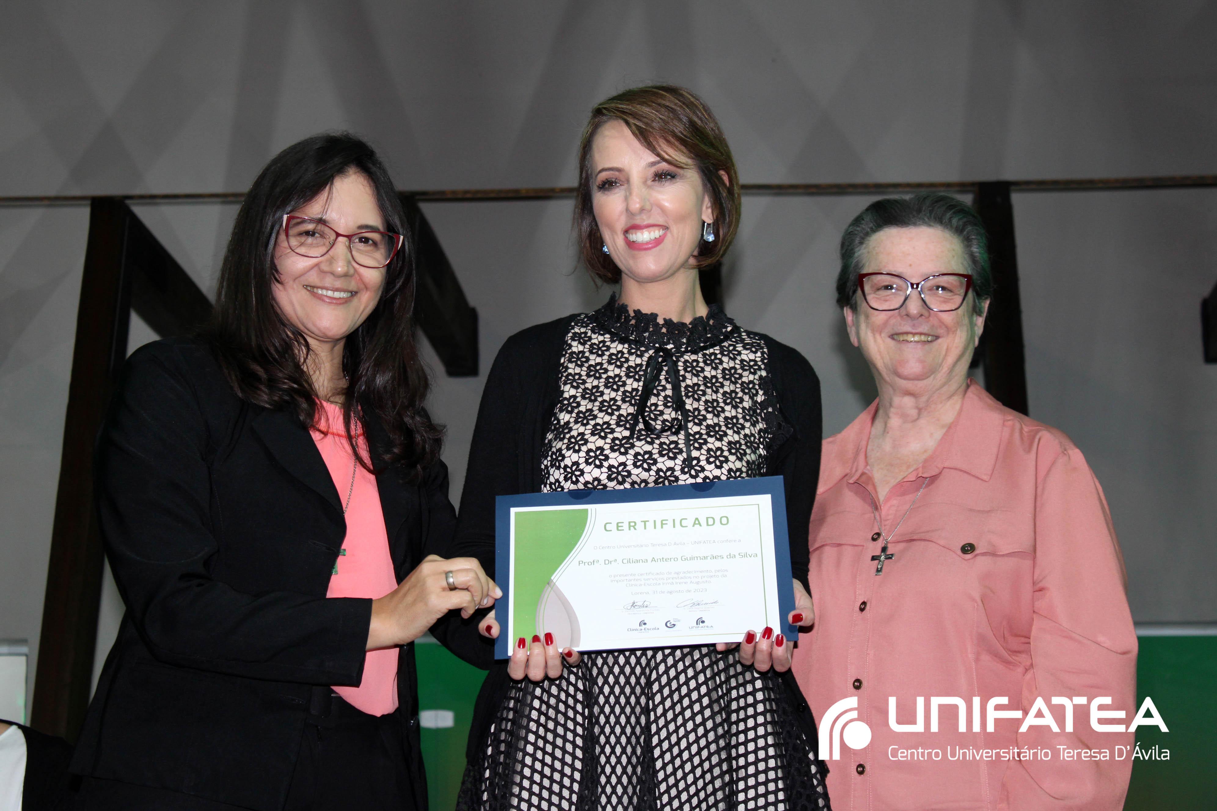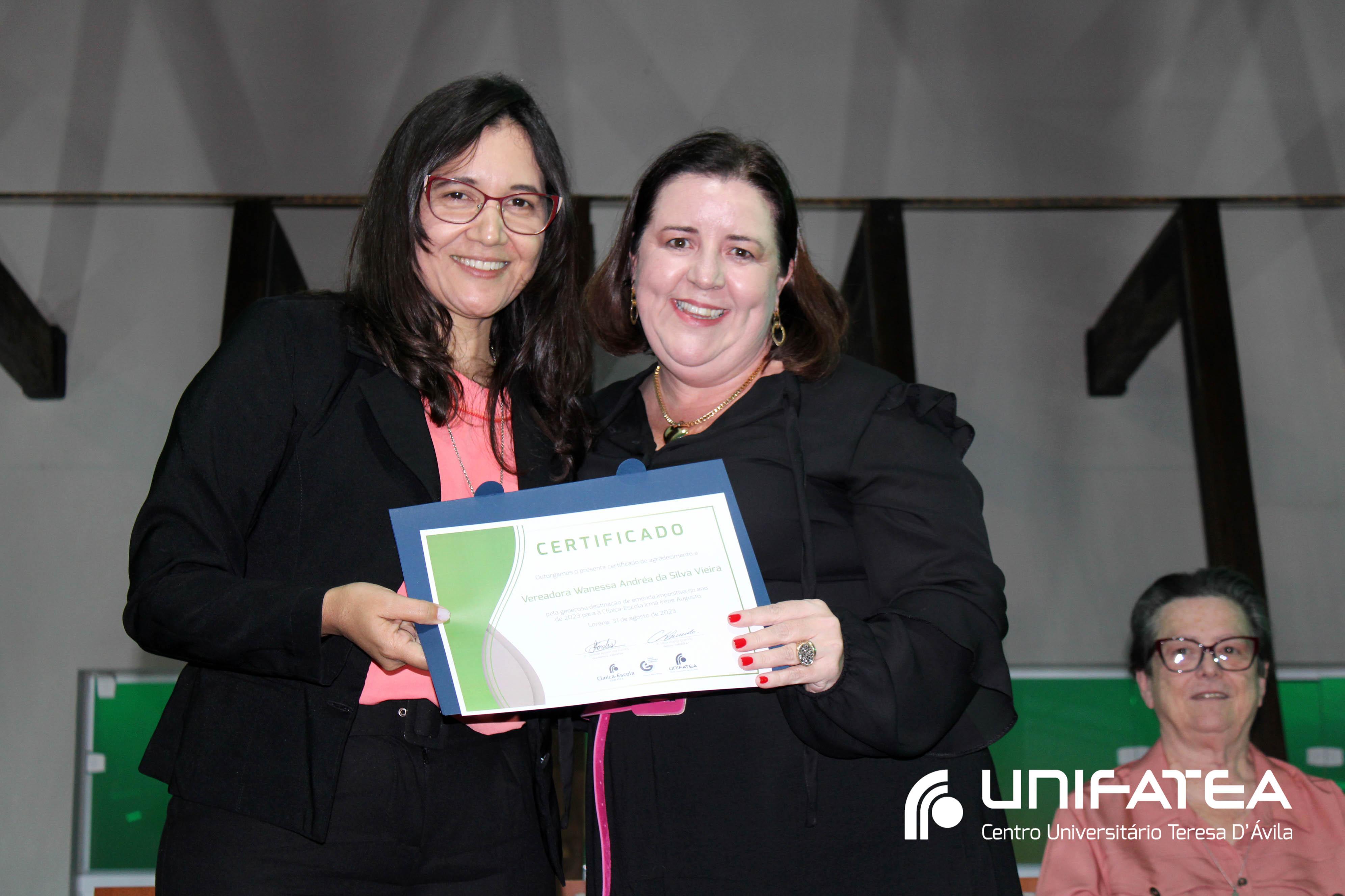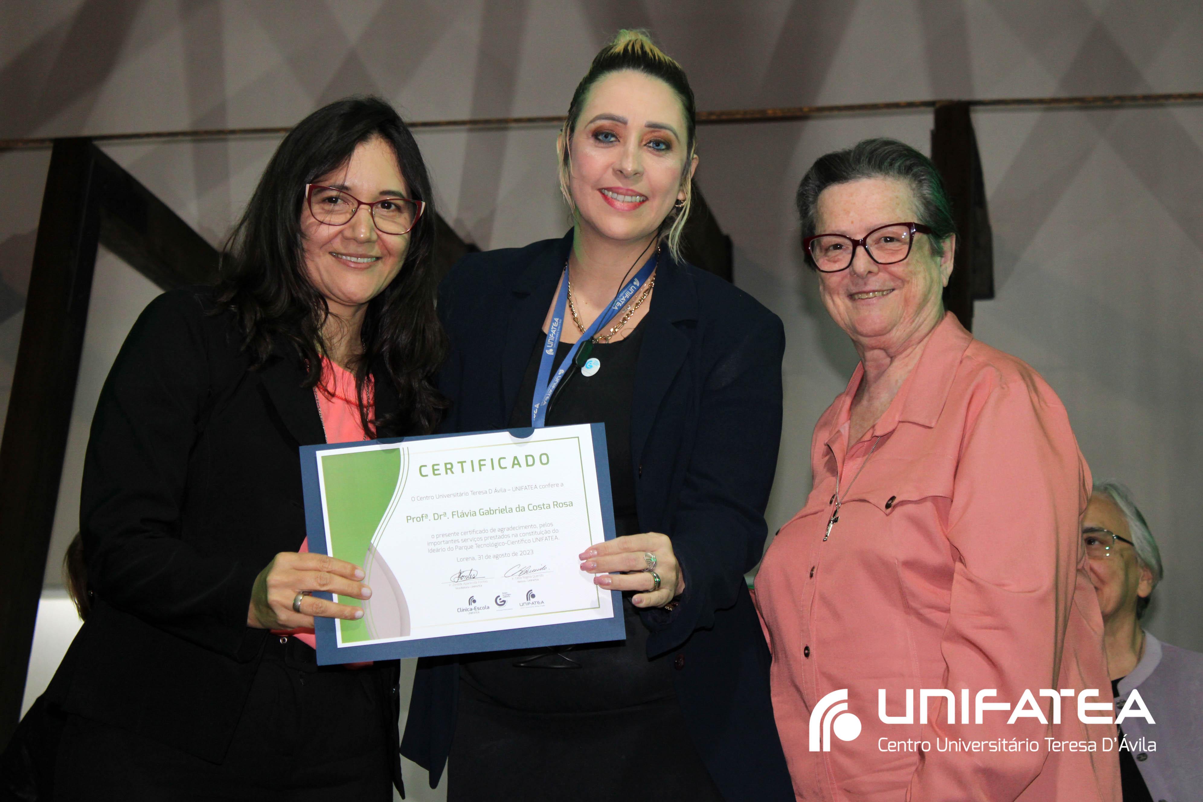Foram entregues certificados Embaixadores da Clínica-escola para Sr. Sérgio Fortes, Sra. Nádia Meireles, Sra. Paola Geronimi; Certificados Embaixadores de Comunicação da Clínica-escola Irmã Irene Augusto e Parque Tecnológico Unifatea para Dra. Marilde Gonçalves de Souza Andrade – Rádio Mix FM e Sr. Eder Bilotta – Jornal Atos; Certificado Embaixador do Parque Tecnológico Unifatea para o empresário Jeremias Rodrigues.