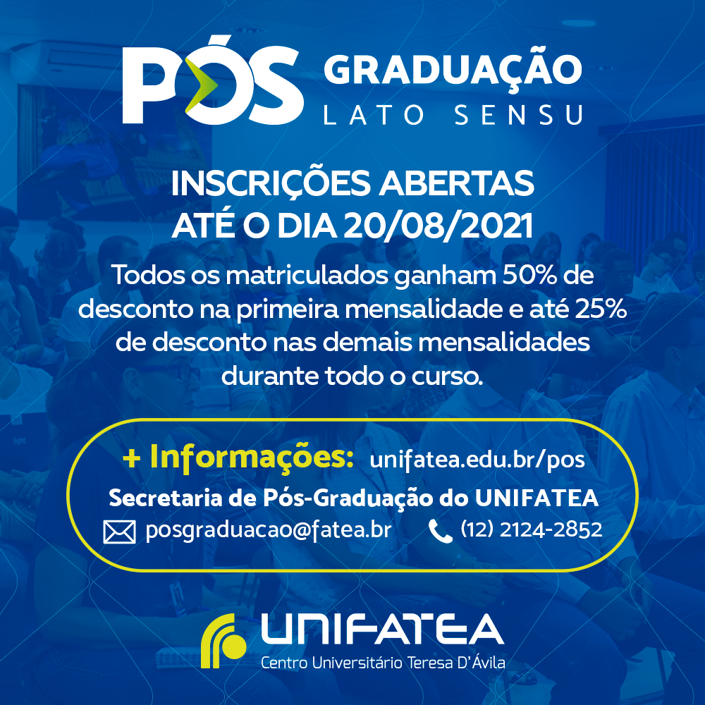 As inscrições para os cursos de Pós-Graduação já estão abertas e podem ser feitas pelo site unifatea.edu.br/pos até o dia 20 de agosto.